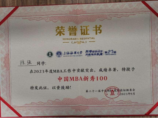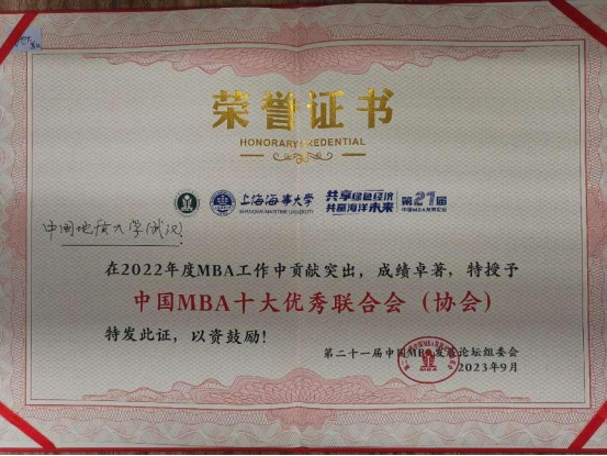 Beat365官网专硕联合会喜获“2022年度中国MBA十大优秀联合会”荣誉称号,MBA2018级学生栾相辉获评“中国MBA校友创新创业新星”称号;MBA2021级、地大MBA帆船协会会长周佩佳获评“2022年度中国MBA新秀100”称号;MBA2023级班长陈强获评“2023年度中国MBA新秀100”称号。