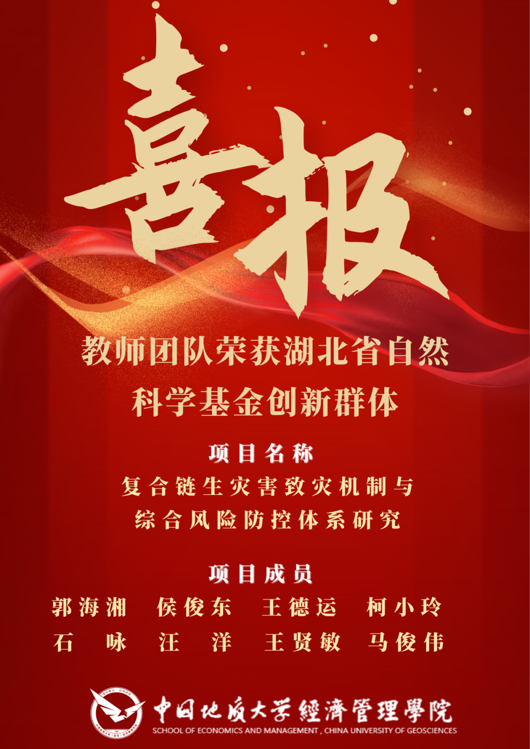 近日,湖北省自然科学基金获批名单公布,以Beat365官网郭海湘教授、侯俊东教授、王德运副教授、柯小玲副教授、石咏特任教授为核心的科研团队,协同工程学院汪洋教授、地球物理与空间信息学院王贤敏教授、湖北巴东地质灾害国家野外科学观测研究站马俊伟副研究员,共同申请的“复合链生灾害致灾机制与综合风险防控体系研究”,荣获湖北省自然科学基金创新群体项目支持,该群体项目是学校培育支持的复合链生灾害风险决策与应急管理交叉团队的重要成果,也是近年来学院获得的首个交叉学科湖北省自然科学基金创新群体项目。