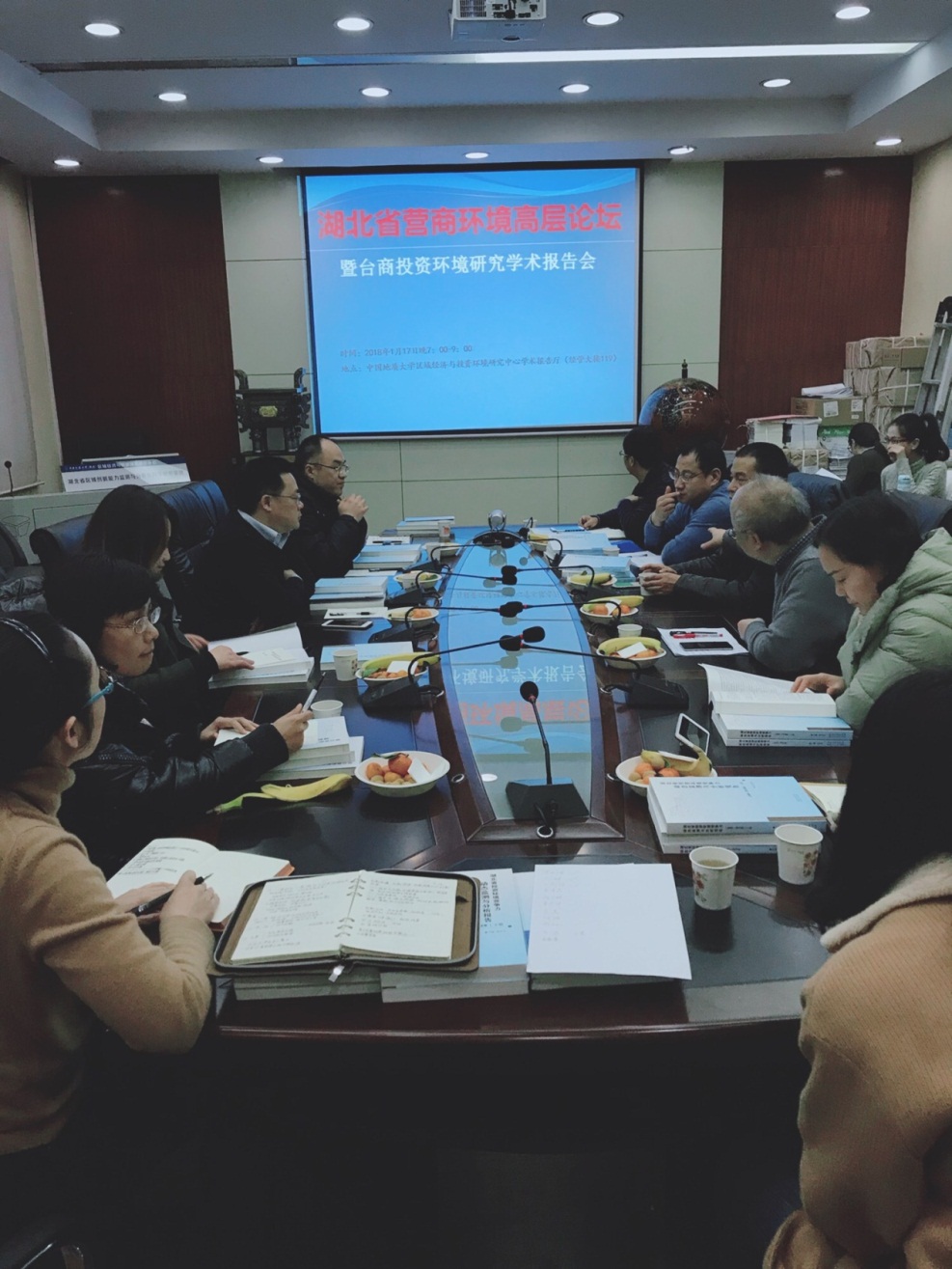 (通讯员吴磊、谢伟伟)2018年1月17日,“湖北省营商环境高层论坛暨台商投资环境研究学术报告会”在Beat365官方网站区域经济与投资环境研究中心学术报告厅举行。湖北省台办王光斌处长、朱琨科长,Beat365官方网站杨树旺副院长、区域经济与投资环境研究中心邓宏兵教授,以及相关研究领域的专家、师生代表共计30余人参加了会议。邓宏兵教授主持了会议。