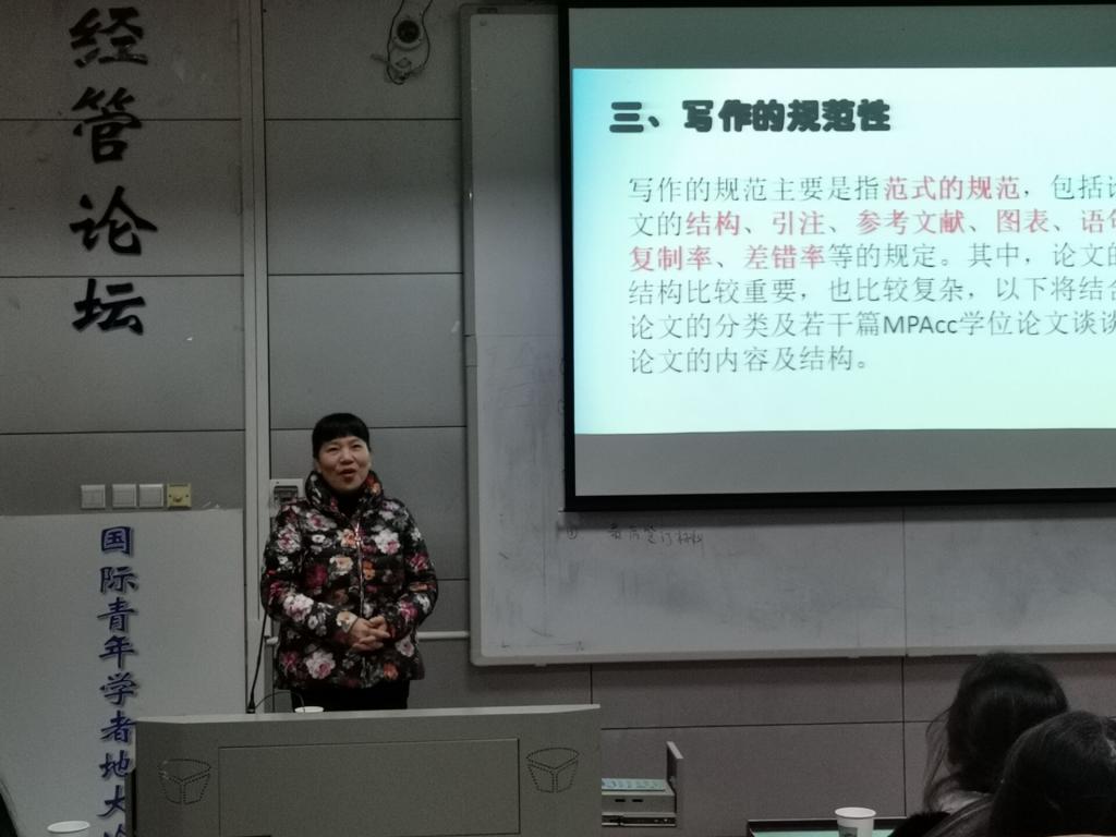 报告中,张蕊教授结合多年教学经验,贴近同学们在学习中面临的实际问题,从“MPAcc学位论文的重要性”、“MPAcc学位论文的选题”、“写作的规范性”和“其他应关注的问题”四个方面展开。