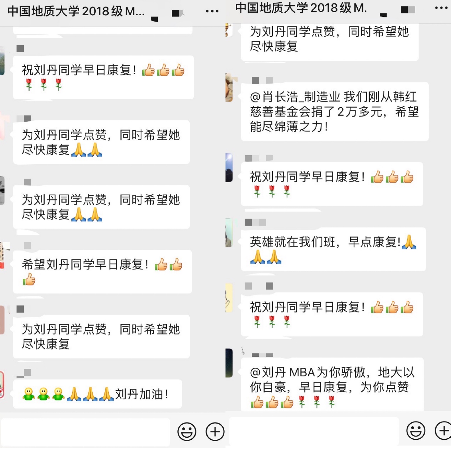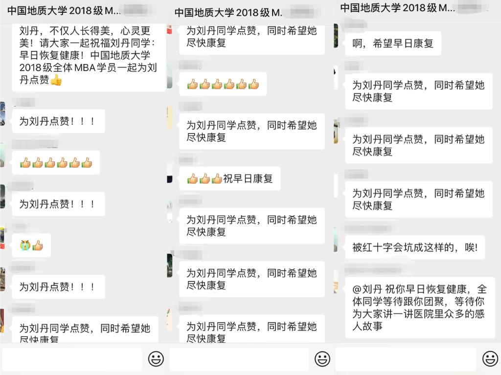 学院领导和老师得知刘丹同学感染的第一时间表达了慰问与关心,并鼓励她放松心情、调整状态争取早日战胜病毒。班级同学们在获悉刘丹同学确诊后都热情地表达了对刘丹同学的祝福,希望她能早日康复。在治疗期间,学院领导和老师与班长一直与刘丹保持联系,时刻关注刘丹同学的治疗情况。由于一月底武汉各医院医护防护物资极度缺乏,经过多方沟通,学院领导及MBA同学一起为武汉市第一医院募捐了一批医疗防护物资。