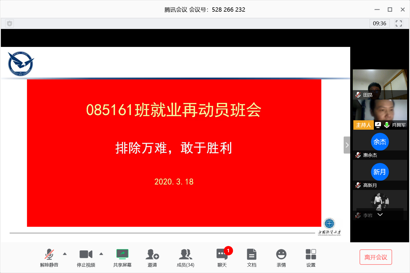 3月18日晚19:30,Beat365官方网站旅游管理专业085161班“排除万难,敢于胜利”就业再动员主题班会顺利举行。受到疫情影响,本次会议通过腾讯会议平台以线上形式开展,班主任、旅游系系主任肖拥军,学院16级辅导员田昆及旅游管理专业085161班全体毕业生共36人参加会议。