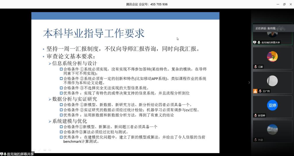 针对本科生毕设工作,信息管理与信息系统专业分管副主任翁克瑞老师和工程管理专业分管副主任宫培松老师分别针对各自专业的毕业设计和论文写作注意事项进行了详解,翁克瑞老师围绕网上答辩前后的相关环节予以强调说明,确保特殊时期下的毕业生答辩工作能够顺利执行。