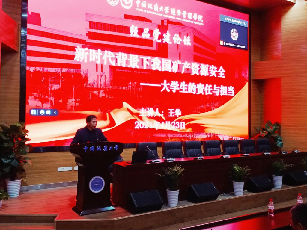 4月23下午,学校党委常委、副校长王华教授作客“经品党建”论坛,以《新时代背景下我国矿产资源安全——大学生的责任与担当》为主题,为全院200余名师生党员讲授第一堂党课。南望山校区师生同时以线上形式同步参与。学院党委书记杨昌锐主持党课。