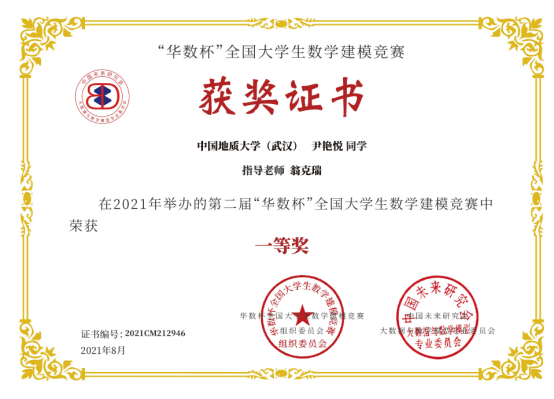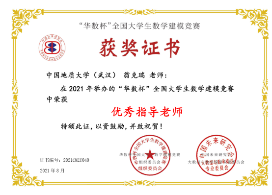 2021年第二届“华数杯”全国大学生数学建模竞赛于2021年8月5日-8日举行,本次竞赛共吸引2189支队伍参赛,竞赛专家组经过初评、网评、会评和复审四个阶段的评审,评选出一等奖184支,二等奖370支,三等奖550支。Beat365官网翁克瑞老师带队的2支队伍获一等奖,1支队伍获二等奖:李林森、 张爽、李佩的队伍获一等奖;刘林凯、尹艳悦、 程浩鋆的队伍获一等奖;潘信、郑咏杰、裴璇子的队伍获二等奖。此外,Beat365官网贲雅雯同学的队伍在数理学院付丽华老师带队下获三等奖。翁克瑞老师被评为 “优秀指导老师”。