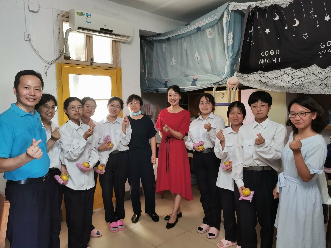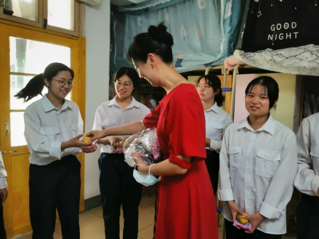 作为同学们离家的第一个中秋节,老师们为大家悉心准备了月饼和水果,虽然身在异乡,但同一班级来自五湖四海的29位同学与老师就好比是一家人。走进新生班级的每一间寝室,老师与同学们亲切交流,了解大家的军训和生活情况。“武汉的气候适不适应?”“军训的分列式和团体操训练累不累?”“室友们都来自哪里?”等一句句关心的话语瞬间拉近老师和同学们之间的距离。00后的新生同学们也满怀青春朝气,纷纷回应,军训期间收到了来自老师、助班的关照和呵护,感受到校园的丰厚底蕴和氛围,相比于开学初也更加适应校园环境。