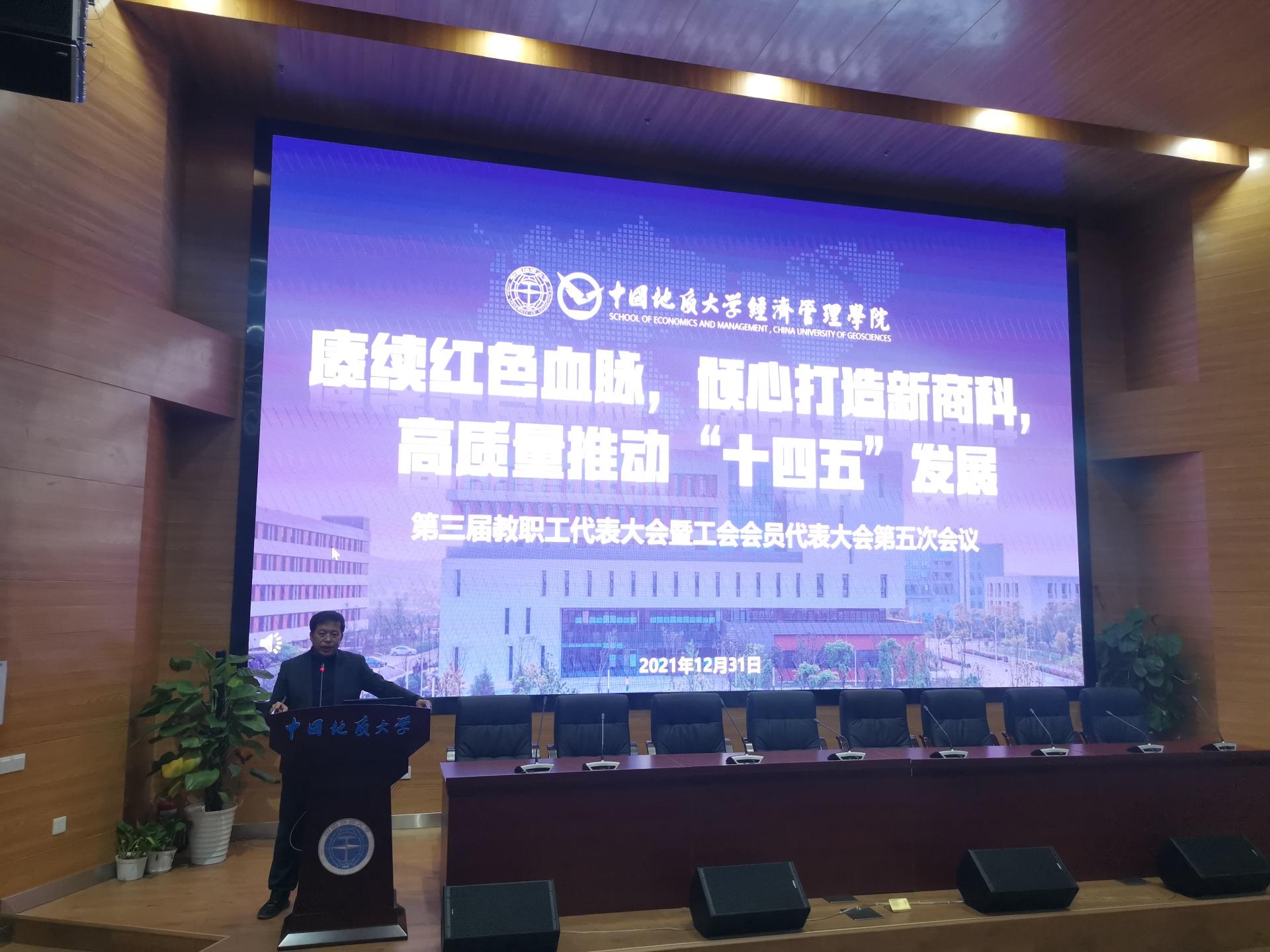 学院党委书记杨昌锐同志发表了热情洋溢的开幕词。他指出,在2021年,Beat365官方网站全体教职工响应“把党的历史学习好、总结好,把党的成功经验传承好、发扬好”的号召,以“学党史,悟思想,办实事,开新局”为行动指南,赓续红色血脉,传承红色精神,发扬优良传统,在回望总结学院过往艰苦奋斗历程的基础上,立足当下国家和社会发展新需求和学校地学特色,把握学院未来建设与发展开拓奋进方向,绘就了学院“十四五”发展蓝图,确立了新时代特色新商科的发展目标,开启了学院继往开来建设发展的新征程。他希望全体与会代表按照大会议定日程,积极参加大会的各项活动,充分履行民主管理和民主监督职能,解放思想,求真务实,把本次大会开成一个团结鼓劲、振奋精神的大会!