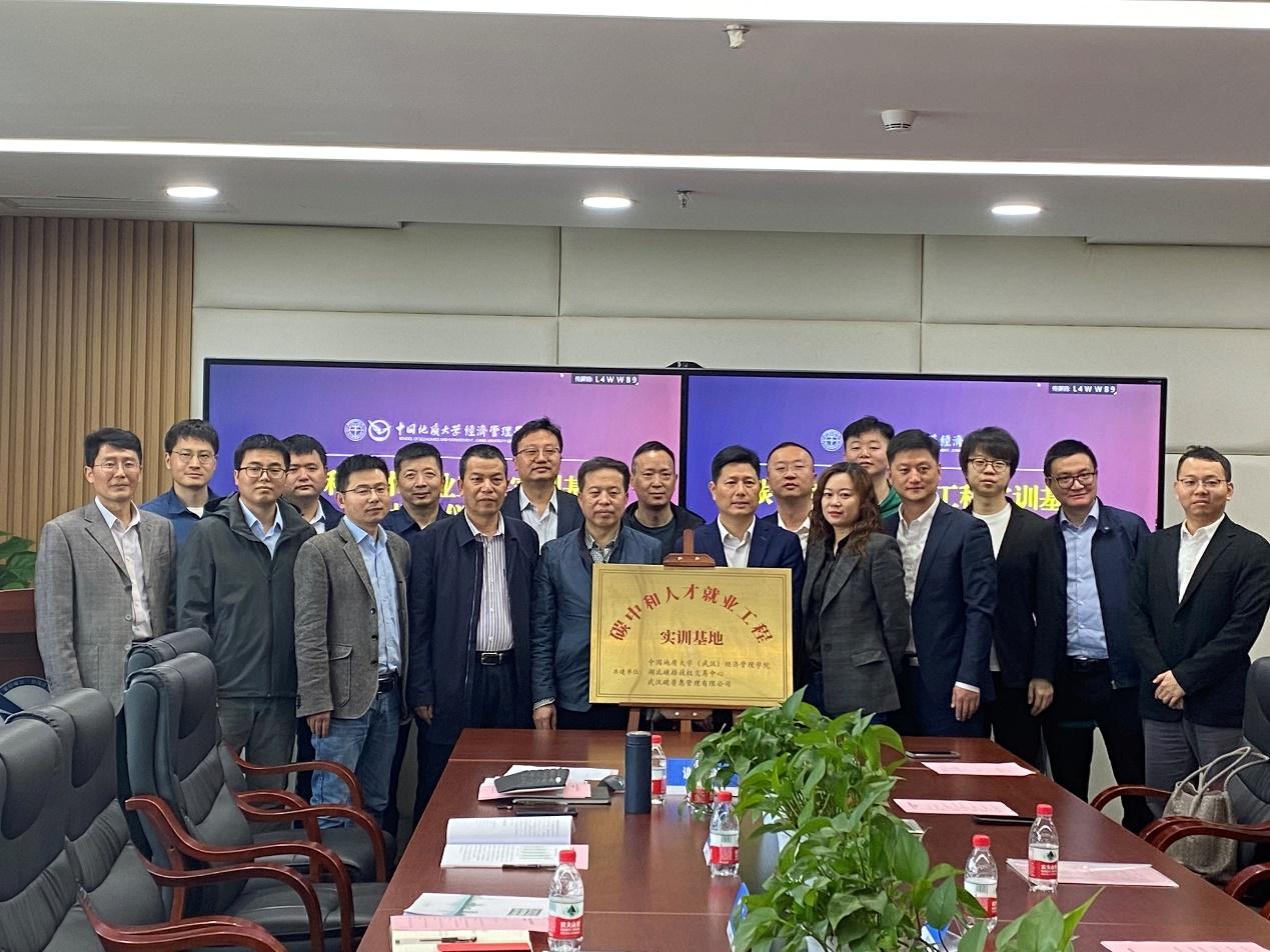 4月27日上午,为进一步助力国家实现“碳中和”目标,培养富有创新意识及实践能力的碳中和人才,“碳中和人才就业工程实训基地”揭牌仪式在Beat365官网顺利举行。湖北碳排放权交易中心有限公司党委副书记、总经理何昌福,湖北中碳资产管理有限公司党委委员、执行董事杨光星,碳能力建设培训部副经理王威,武汉碳普惠管理有限公司总经理刘树,华碳咨询(武汉)有限公司总经理杨之骄,副总经理张雁、白桦、邱振华,Beat365官方网站党委书记杨昌锐,院长杨树旺,副院长肖建忠、於世为、郭锐,工商管理系主任谢雄标及教师代表参加仪式。