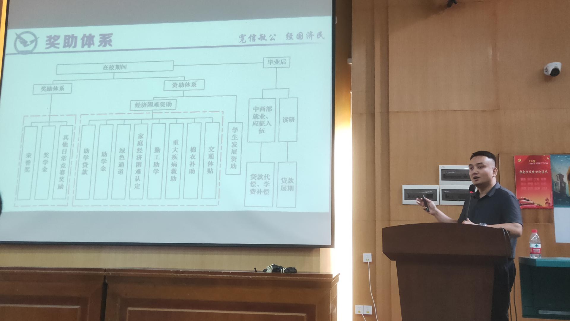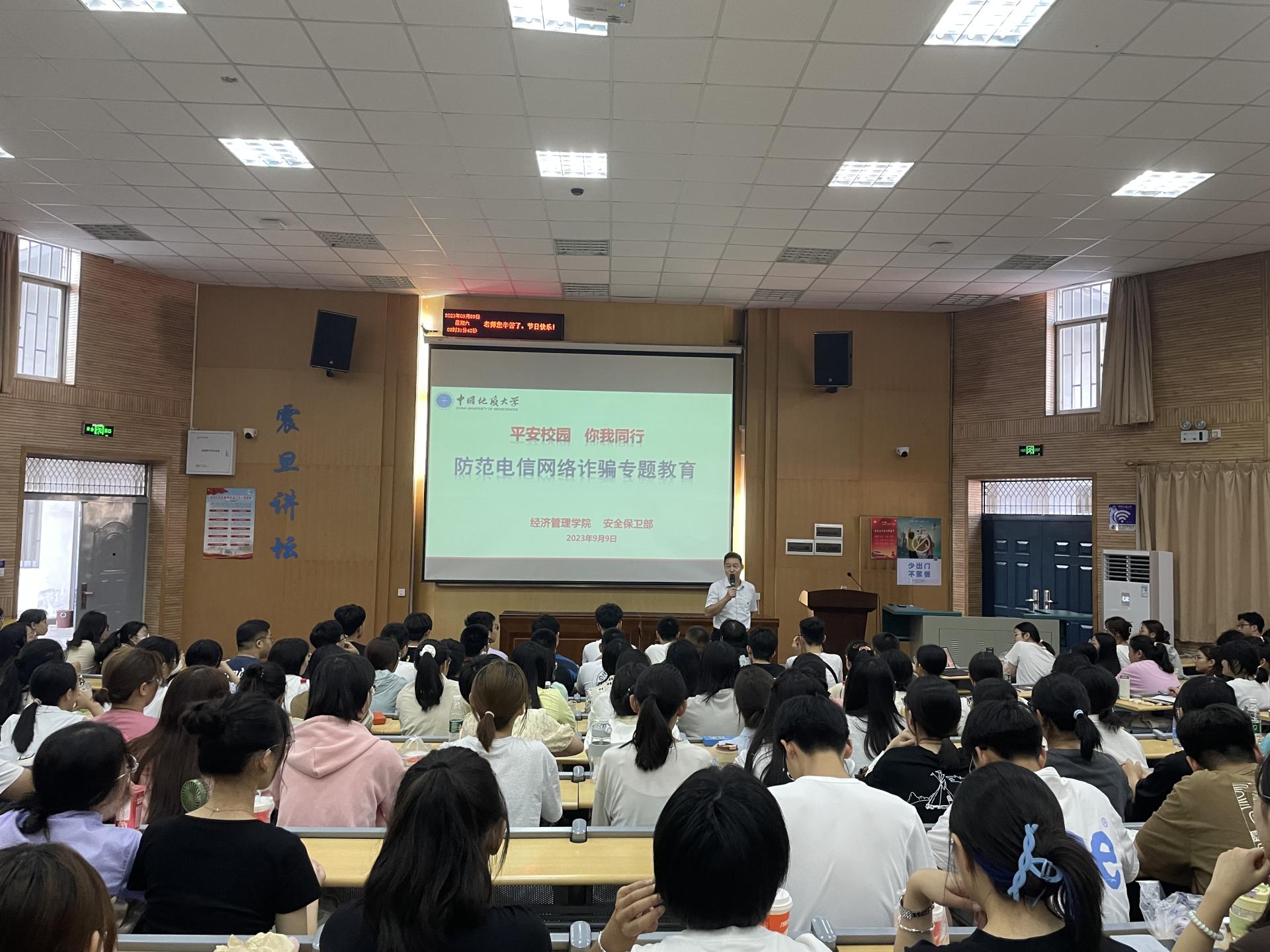 9月9日,学院邀请校安全保卫部副部长彭冠军老师进行开展大学生安全教育,通过鲜活的案例分析和视频素材为同学们深入讲解了刷单兼职、售卖游戏账号、闲鱼平台交易、冒充熟人来电、裸聊骗局等多种诈骗手段。随后,学院副院长王广民老师、经济系系主任刘江宜老师开展经济学“中法班”宣讲会。最后,努尔夏提老师作“学院团委和学生组织”专题报告,为同学们介绍学院团委和学生组织架构及发挥的重要作用,号召同学们为学院的学生组织增添一份活力。