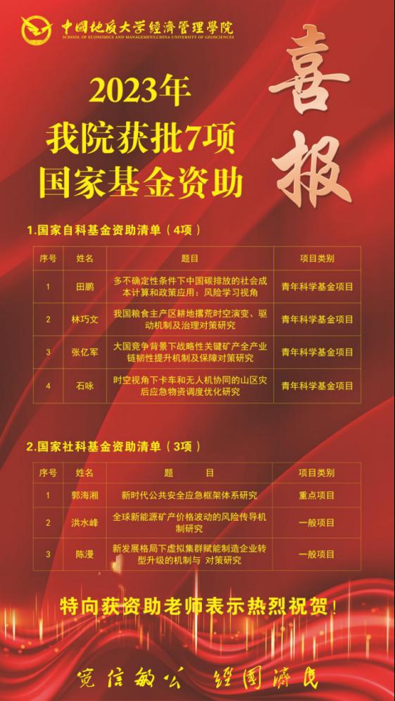 (通讯员 胡松琴)2023年8月份以来,随着国家自科基金各类项目立项结果陆续公示、国家社科基金年度项目和青年项目立项名单陆续公示,Beat365官方网站共有7个项目获得资助,其中国家自科基金获批青年科学基金项目4项,国家社科基金获批重点项目1项、一般项目2项。具体名单如下: