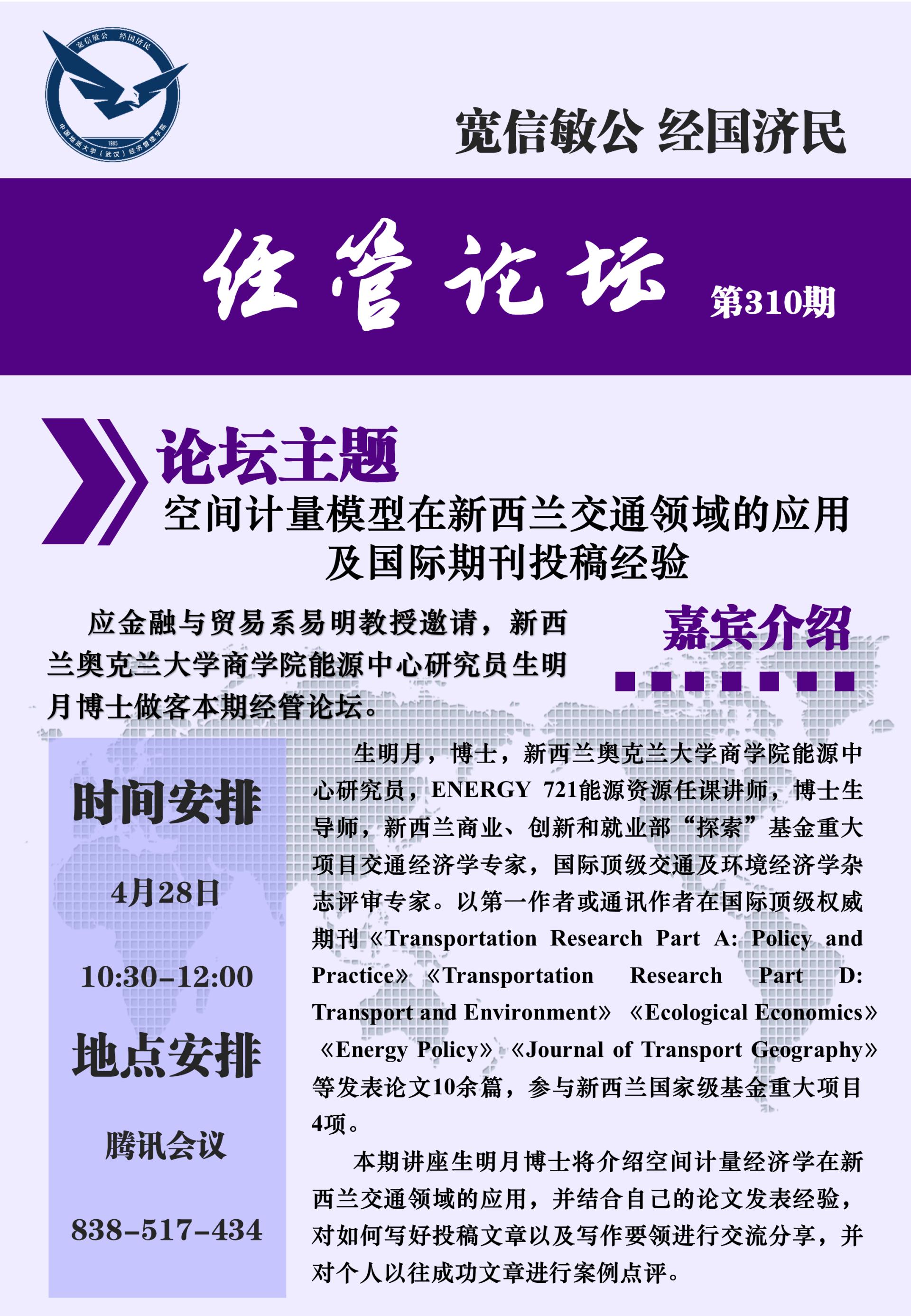 经管论坛(第310期)空间计量模型在新西兰交通领域的应用及国际期刊投稿经验
