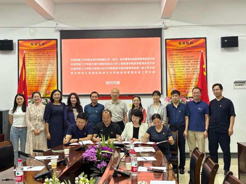 座谈会后,李江敏教授还代表旅游管理系党支部,同全国党建工作样板支部中南财经政法大学工商管理学院旅游管理系党支部、全国党建工作样板支部湖北经济学院旅游与酒店管理学院第二党支部、湖北大学旅游系党支部分别与贵州师范大学国际旅游文化学院旅游管理系教工党支部结对共建,签署了合作共建的共创协议。