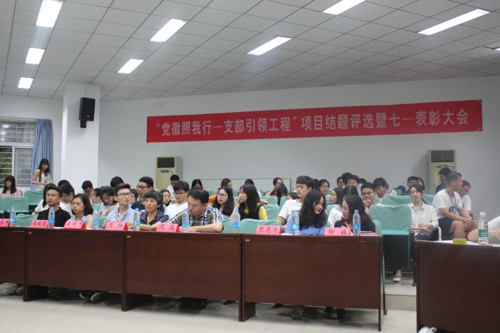 018年6月19日晚19:00,Beat365官方网站2017-2018年度“党徽照我行——支部引领工程”项目结题评选暨七一表彰大会在北一楼报告厅顺利召开。学院党委书记隋红书记,副书记沈波书记,学工组全体成员老师以及本科生党支部、研究生党支部、经管学生会主席团代表们参与了本次大会。