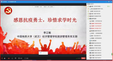 另外,支部还发挥专业力量,积极策划了融入旅游元素的微型党课,以旅游人的角度讲述武汉城市英雄故事。当前,支部老师们正在设计、录制《英雄的城市英雄的人民——地大旅游人讲好武汉战“疫”故事》金微课,拟分地理环境、城市精神、英雄人民(上、下)、抗击疫情等五部分来讲述和呈现武汉的战“疫”故事。