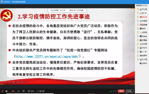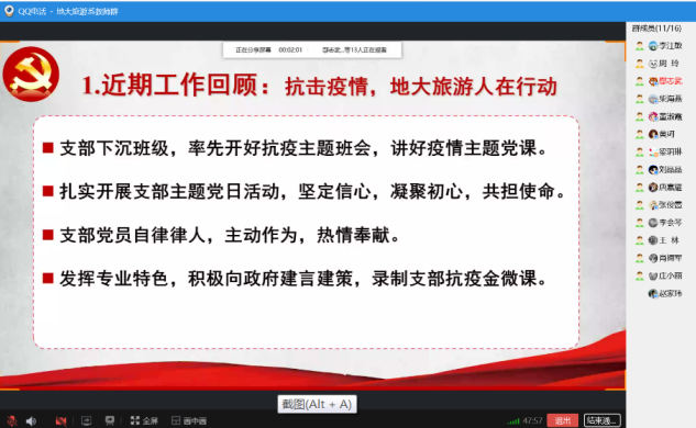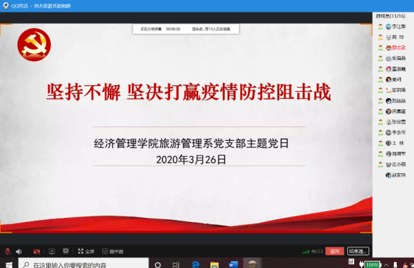 学习一开始,支部书记李江敏以“抗击疫情,地大旅游人在行动”为主题,对前一阶段支部和全系师生抗疫情况作了简要回顾和总结。在前一阶段,旅游管理系全体师生坚决响应党中央和国家教育部的号召,以坚定的信心和必胜的决心投入到抗击疫情的教学、学习和生活之中,大家在工作和学习中共担使命,主动作为,奋发创新;在生活中守望相助,自律律人,热情奉献。线上开学以来,旅游管理系全体教师坚守“立德树人”初心,不仅实力保证线上课堂教学高质量推进,还在学生思想教育和心理舒解、学业和就业指导中戮力同心,孜孜不倦,在战“疫”时期的旅游人才培养和学科建设的征程上共同奋发前行。另外,旅游管理系教师还充分发挥专业特色,为政府提供灾后旅游产业复工复产的政策建言,设计制作支部抗疫金微课等,展现出地大旅游人的社会责任和担当。