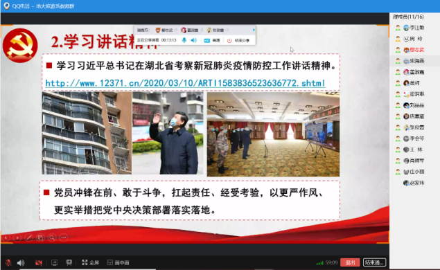 (旅游管理系党支部宣)2020年3月26下午,旅游管理系党支部主题党日以QQ电话会议召开,支部全体党员、外派挂职党员和群众教师全员参加会议。按照校党委的指示,此次支部主题党日活动以“坚持不懈,坚决打赢疫情防控阻击战”为主题,分回顾近期工作、学习讲话精神、学习先进事迹等三个环节进行。