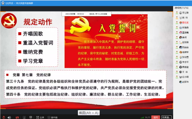 学习活动的最后,李江敏书记带领大家重温了党章第七章的内容,即“党的纪律”,要求全体党员教师必须严格执行和维护党的纪律,自觉接受纪律约束,在关键时期要提高政治站位、增强责任意识,要将纪律挺在前面,发挥出党员在复工复学、师生返校工作中的先锋模范作用,并号召群众教师务要严格遵守各方面的复工复产和返汉返校纪律要求,保障校园环境的安全,为有序恢复学校正常工作秩序作出应有的努力。