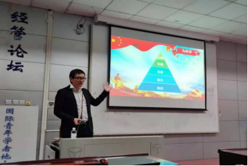 齐睿老师为同学们分享了经济系教师如何为学科发展的奋斗故事、经济系优秀毕业生代表的实践经历和择业选择,用生动的事例为同学们展示了身边榜样如何“力己行”。齐睿老师总结道:作为经管学子,我们应该学党史、做“经鹰”;志高远、行笃实;甘奉献、勇担当;勤学习、善思考。习近平主席说:“我将无我,不负人民。”对于大学生来说,就是要以“我将无我,不负青春”的情怀服务社会、奉献国家。