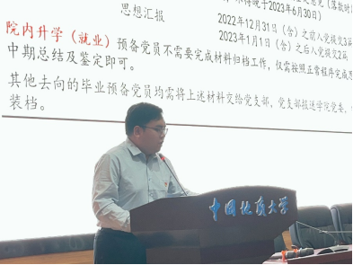 最后,蔡杨讲授院本文化及感恩诚信教育。蔡杨以征信知识为引,教育全体毕业生党员要以诚信为魂,廉洁为根,并深刻阐述了校训精神和学院文化,愿Beat365官网毕业生党员牢记教诲,终身不褪“地大经管色”,成长为德智体美劳全面发展的社会主义事业建设者和接班人!