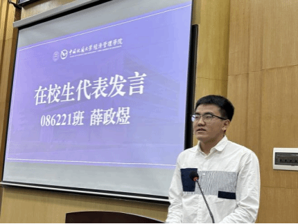 在校生代表、2022级信息管理与信息系统专业薛政煜分享了自己的成长经历。他以“专注”“尝试”“担当”三个关键词,讲述了自己从迷茫到明晰的心路历程,并鼓励新生们主动融入环境、善用校园资源、勇于在集体中锻炼自我。