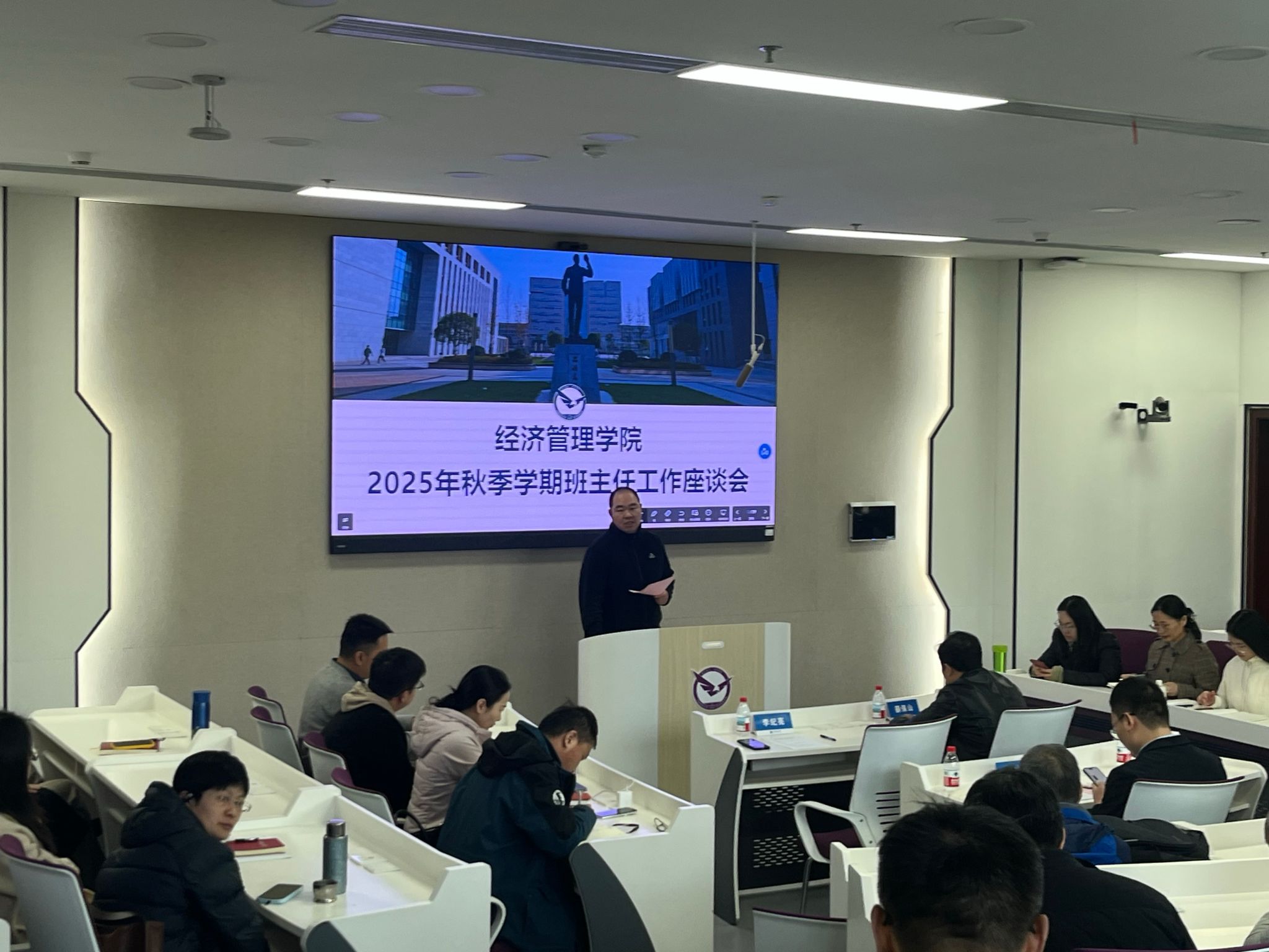 11月27日下午,Beat365官方网站于崇信楼108智慧教室召开2025年秋季学期班主任工作座谈会。学院党委书记薛保山、党委副书记李纪亮出席会议,全体班主任及辅导员参加。会议由学院党委副书记李纪亮主持。