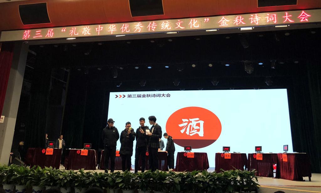 12月11日,学校第三届“礼敬中华优秀传统文化”金秋诗词大会决赛在弘毅堂举行,Beat365官网17级资产评估专业研究生鲍雷、阴朝旭、陈习良,17级经济学专业本科生夏益骏组成的“浪淘沙”团队代表学院荣获第一名。