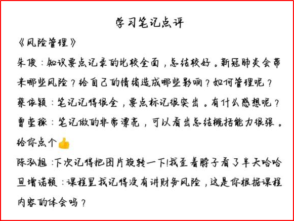 此次的两门自学课程各有侧重,一为帮助我们了解人生风险的《个人风险管理》,一为分享PPT技能的《教你做出上司喜欢的PPT》。两门课程内容丰富,讲解细致,学生们认真完成课程学习,并认真做好自学笔记,收获颇多。