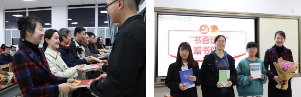 活动嘉宾和旅游管理系党支部教师为旅游管理“书香班级”赠书(右图为李江敏老师向活动赠送著作)