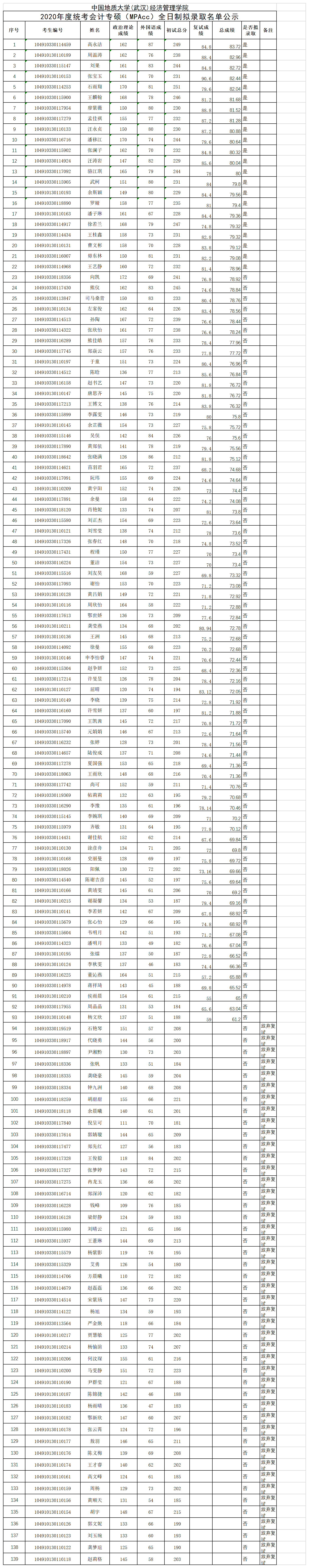 2020年度统考会计专硕(MPAcc)全日制拟录取名单公示