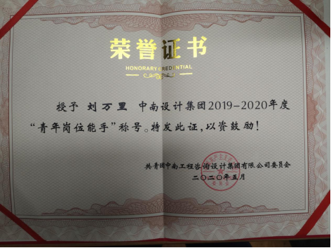刘万里校友单位“青年岗位能手”荣誉