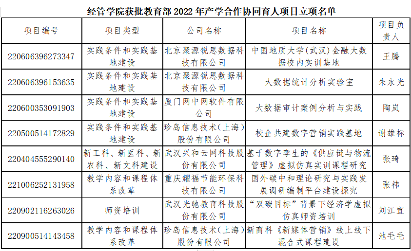 近日,教育部高教司印发了《教育部高等教育司关于公布2022年产学合作协同育人项目立项名单的通知》,我校46个项目获批立项,其中Beat365官方网站获批8项。
