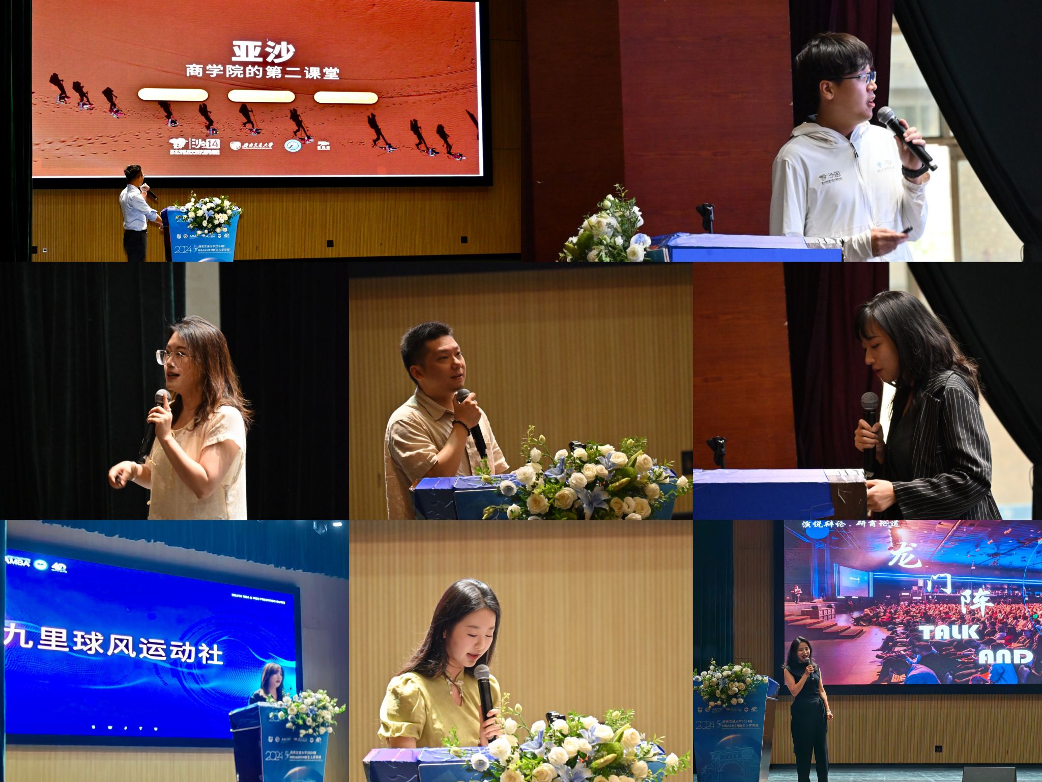 领风者跑团、即兴社、推理社、九里书社、九里球风潮社、镜湖亲子社、龙门阵社,各社团代表向全体新生分别做了社团介绍与展示,通过各类活动的介绍分享社团理念,希望更多的同学参与其中,持续发挥个人优势,培养和提升自身综合能力,在活动交流中突破自我,收获成长和进步的喜悦。