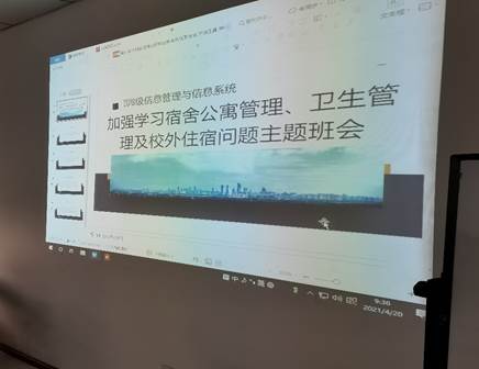 2021年4月20日,英国上市365官网2018级信息管理与信息系统专业开展组织了一场简短而重要的班会。主题是学习学生公寓管理办法、校外住宿管理办法、宿舍卫生管理办法。本次班会的主持人是管信二班的生活委员穆青松,由他在讲台上展示PPT并讲解。
