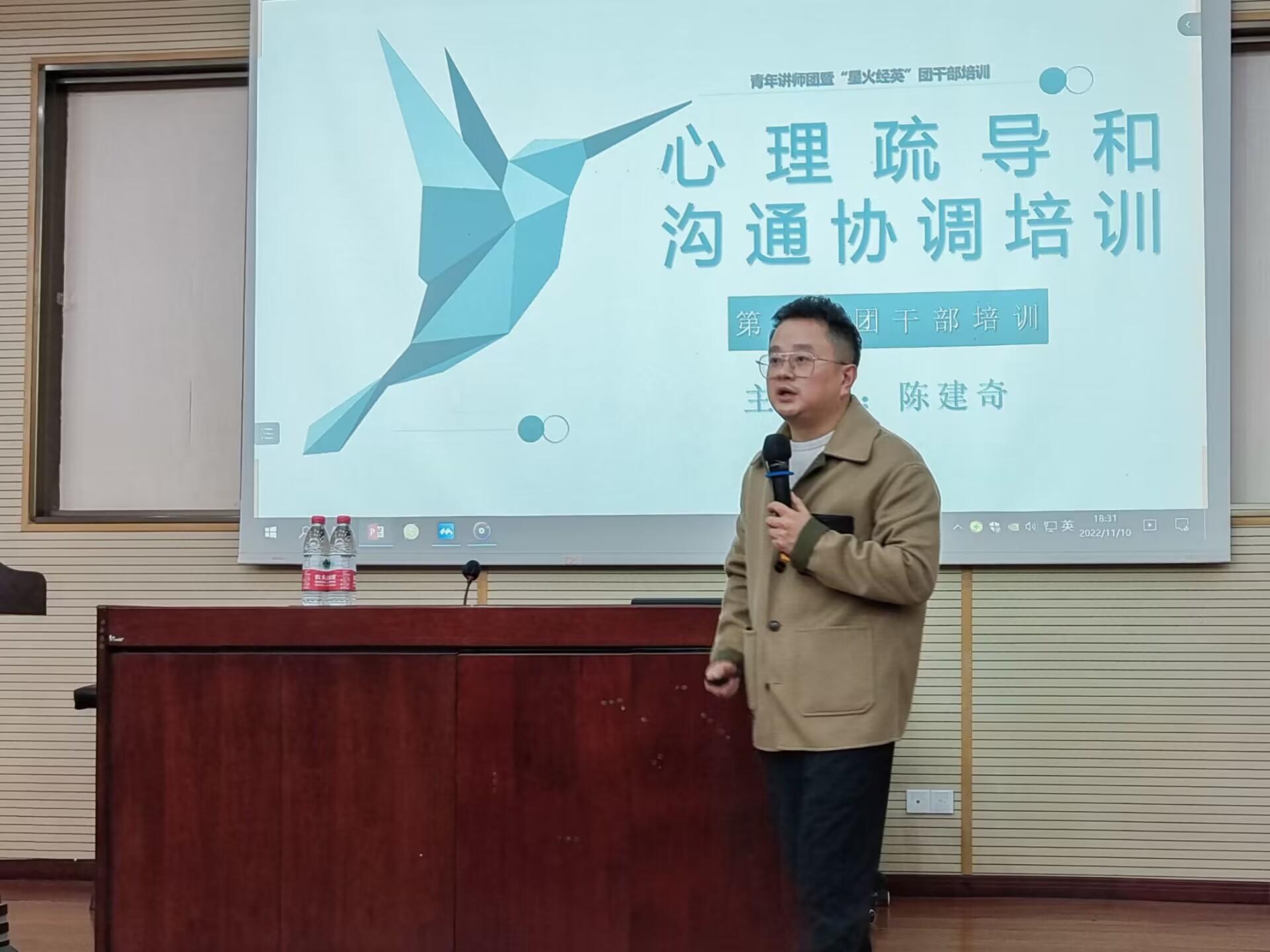 2022年11月10日晚,英国上市365官网于J0202教室开展了“星火经英”计划第十期第八次团干部培训,本次培训由分团委副书记、英国上市365官网本科2020级辅导员、青年志愿者协会指导老师陈建奇主讲,培训主题为“心理疏导和沟通协调培训”,旨在让团干部们了解心理疏导,明白进行大学生心理疏导以及沟通的重要性以及如何开展。