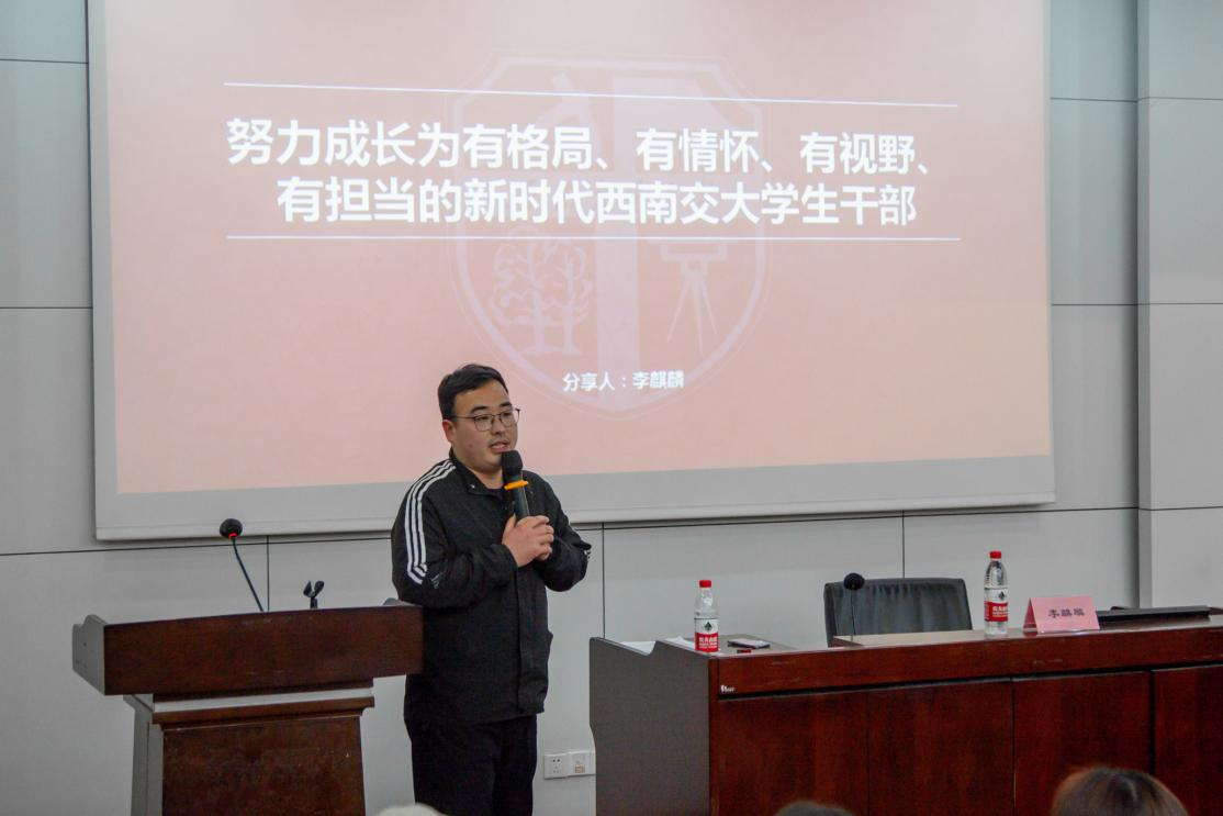 开班仪式结束后,第一次团干部培训正式开始。本次培训由李麒麟主讲,培训主题为“努力成长为有格局、有情怀、有视野、有担当的新时代西南交大学生干部”。