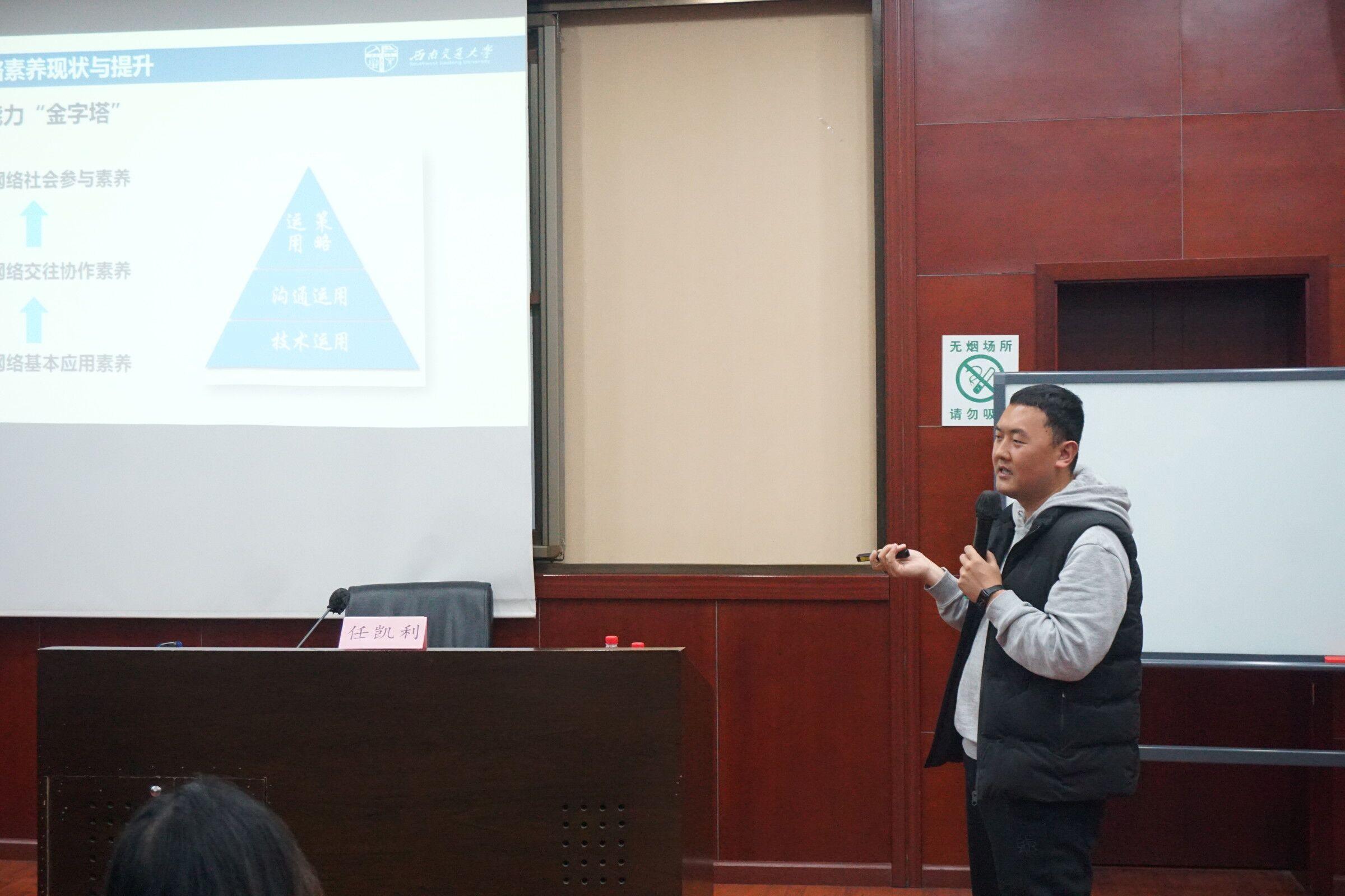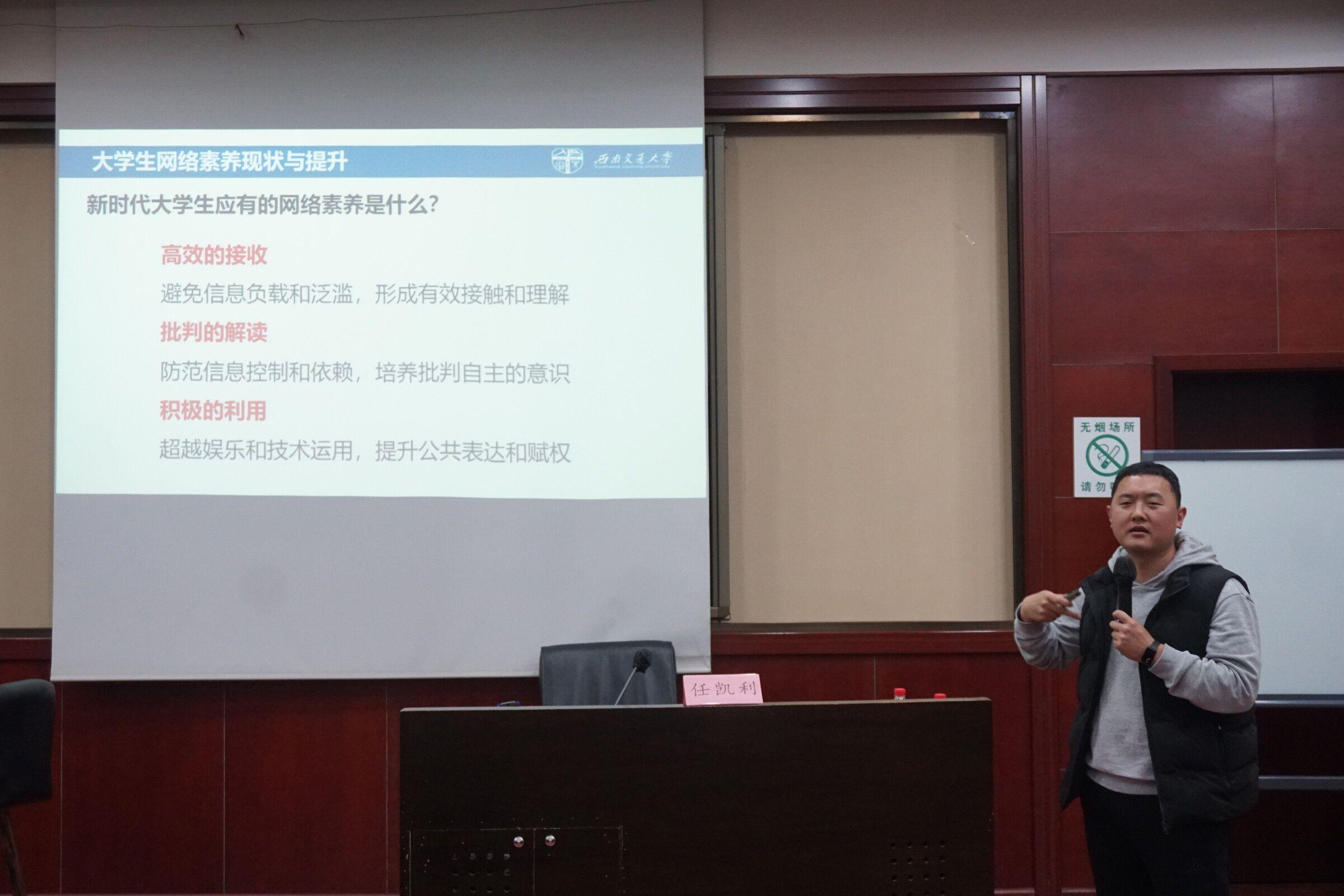 他提到“自投罗‘网’,方能网罗未来”,鼓励同学们接触并了解新媒体,主动提升自身网络素养,培养高效接收、批判解读和积极利用网络信息的能力。另外,他还指出当代大学生在网络素养方面缺乏的“十个力”,用举例和提问的方式引发同学们进行自我反思。