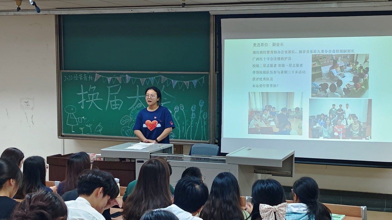 会议伊始,2022届经管青协会长王悦首先发言,王悦总结了过去一年来青协的收获与不足,同时也对主席团的工作做了简短的总结,希望下一届青协骨干有所突破,有所创新。