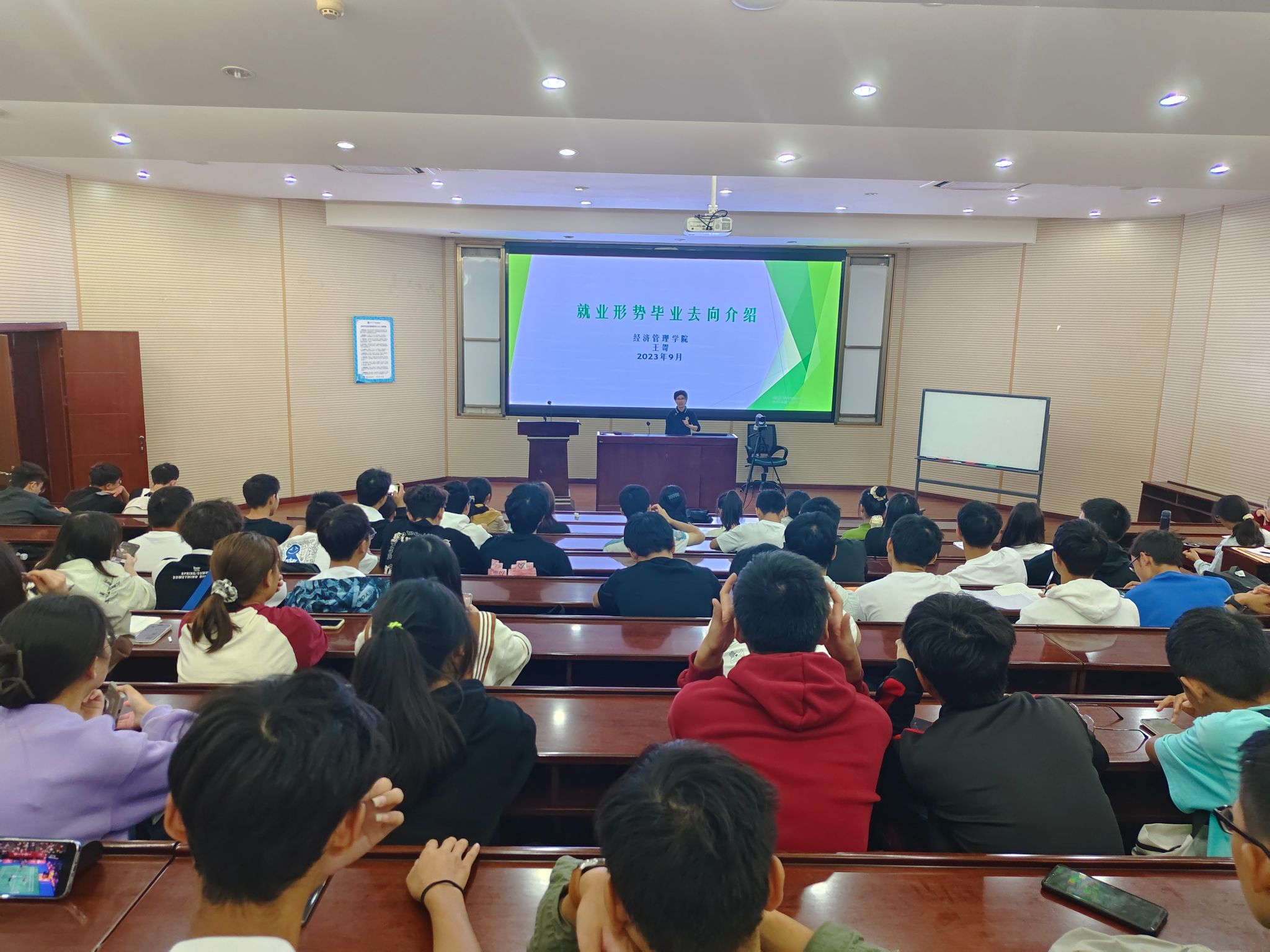 王老师首先从新冠疫情对就业的影响、就业竞争大就业压力大、毕业生心态变化、用人单位对毕业生的需求变化几个方面给同学们介绍了当前的就业形势与未来趋势。王老师给同学们分析了社会单位特别是企业开展校园招聘的节奏及秋招和春招的不同;介绍了目前的考研形势及学院学生考研的一些基本情况。在毕业去向方面,王老师介绍了大学生毕业时可能有的去向选择,重点介绍了升学这一选项,国(境)内升学及选择和出国(境)升学两种选择及不同。