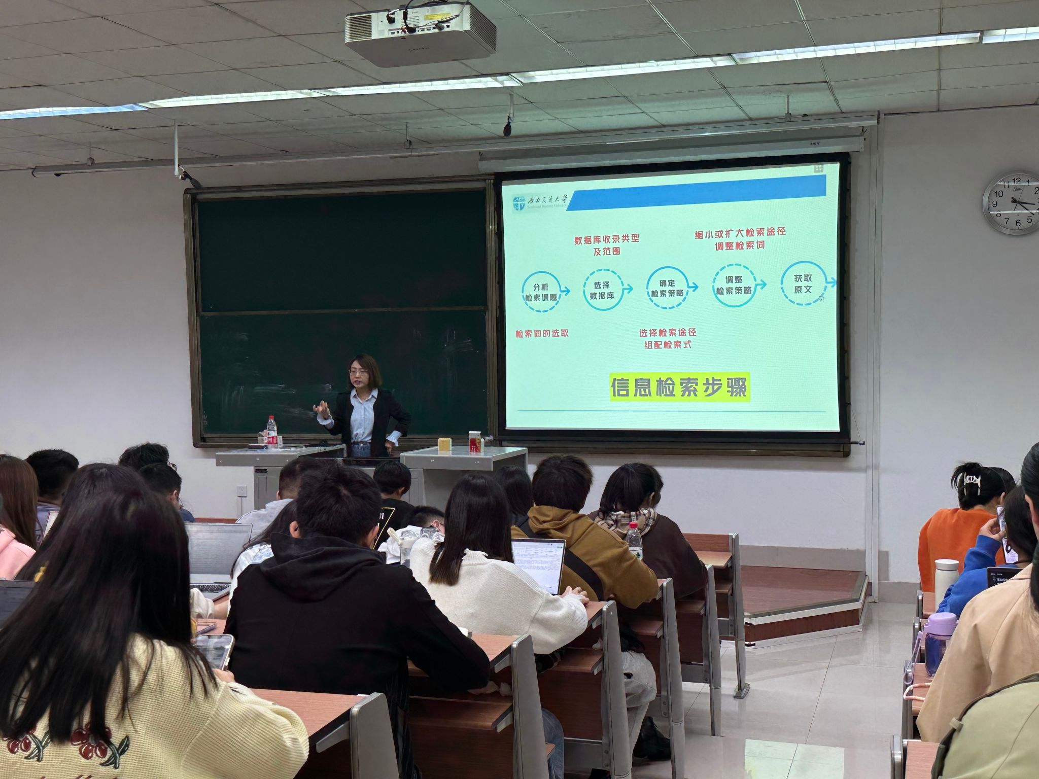 在清楚了电子图书、期刊论文、学位论文、数值数据信息和免费学术资源的获取方法后,李颖老师根据我校图书馆的特点为同学们介绍了图书馆数据库使用的技巧,主要包括信息检索的步骤、检索词的选取技巧、外文文献的获取步骤、挑选文献的技巧等,同时提醒同学们灵活调整检索策略,兼顾查全率和查准率,并以WOS平台的SCI和CPCI文献资源获取为例向大家深度演示了外文文献资源的获取步骤。
