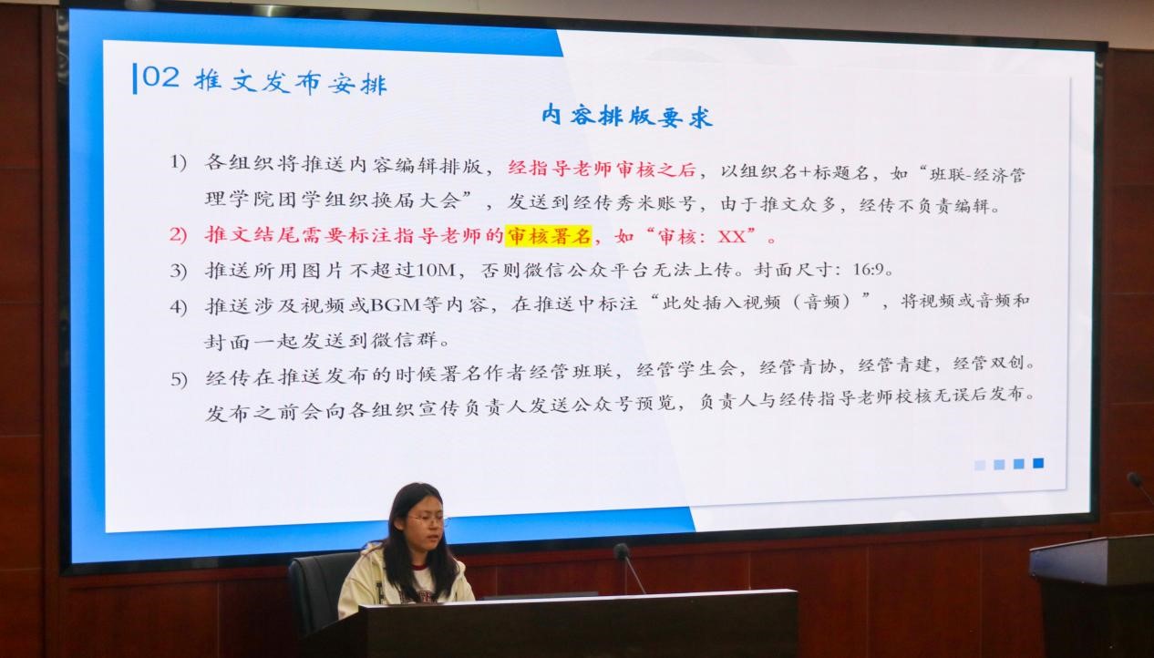 在团学组织新闻会议培训会中,经英传媒中心传媒事务部冯婉晴以“公众号‘交大经管新青年’推文发布相关事宜”为主题,从推文写作要求讲解、推文发布安排、推文规范三个方面进行了详细全面的经验总结。对公众号、内容排版、头条安排等做了明确的要求,同时也对出现过的问题做出了总结及应对方案。