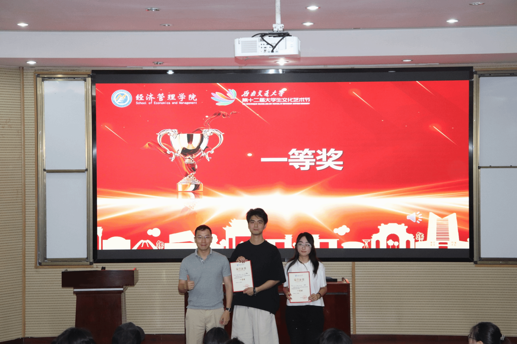 经过评委打分和大众评审投票,各奖项逐一揭晓,由各嘉宾老师为获奖队伍代表颁奖并合影留念。活动最后,余小英老师进行致辞。她表示,此次微电影大赛作品,反映出新时代青年热爱生活、积极进取的精神风貌,给予观众们灵魂和情感的滋养。此次微电影大赛不仅是一场视听盛宴,更是同学们展现创意与才华的重要平台,未来将继续搭建此类交流展示的舞台。期望同学们永远保持赤子之心,用镜头寻找光的方向,在未来的银幕上,继续书写属于新时代交大青年的光影诗篇。