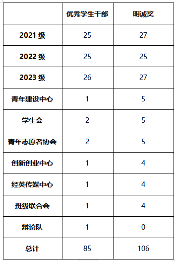 4. 校级学生组织推荐的“优秀学生干部”、“明诚奖”不占用学院名额,由党委学生工作部牵头开展校级学生组织“优秀学生干部”、“明诚奖”评议、推荐工作,并将相应名额追加至各学院。