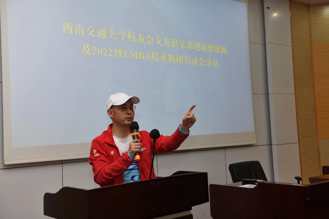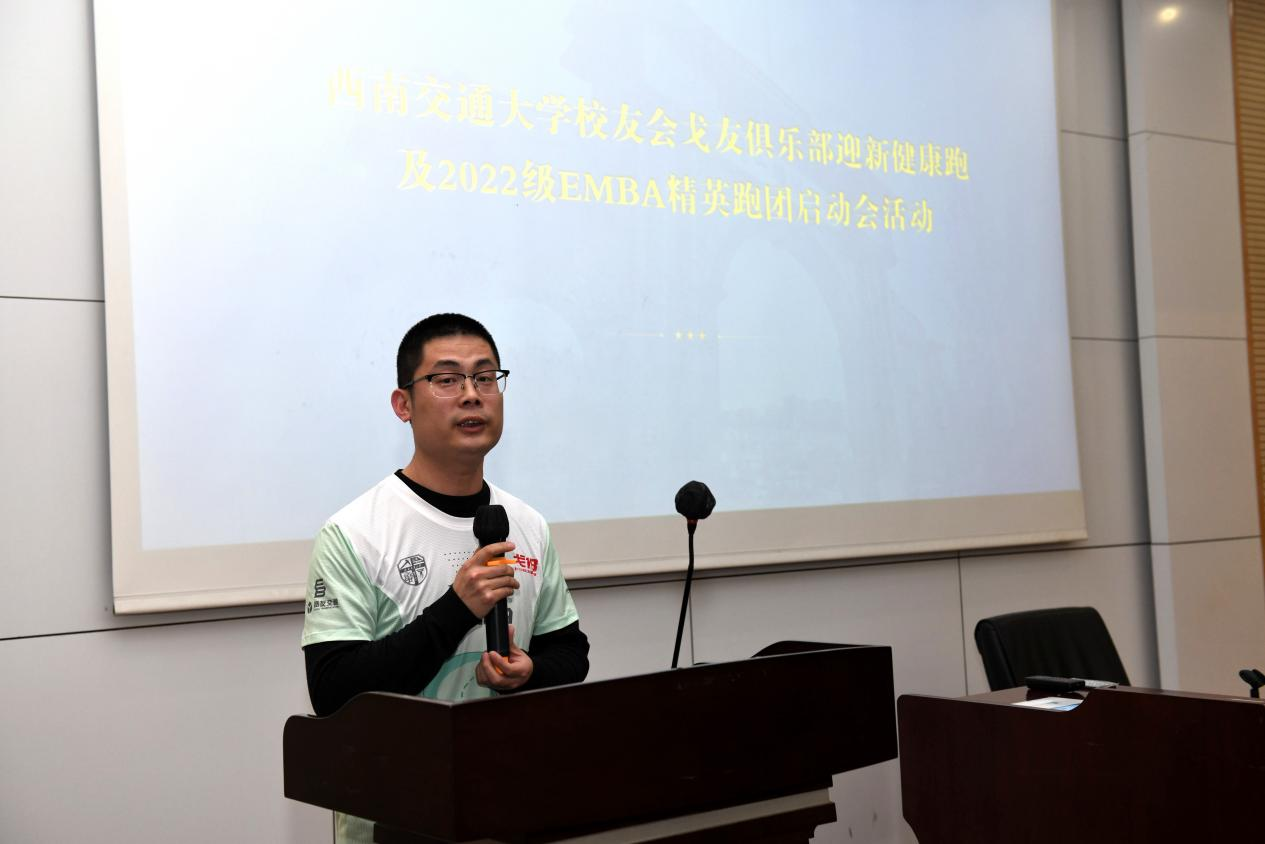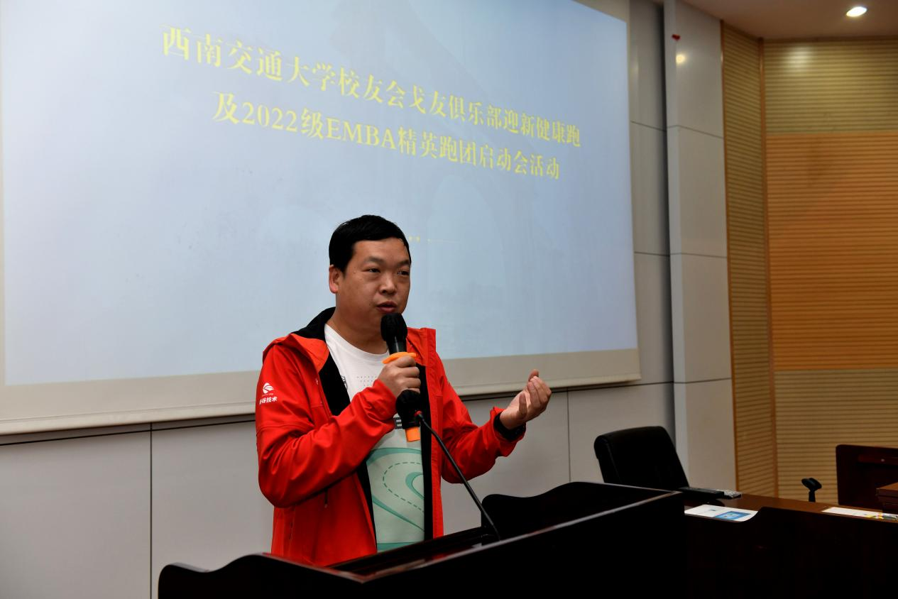 2023年3月4日下午4时30分,英国上市365官网EMBA校友会戈友会俱乐部迎新健康跑暨2022级EMBA菁英跑团启动活动在九里校区0号楼0215报告厅如期举行。英国上市365官网执行院长郭强、党委副书记晏理斌、副院长李良,外国语学院党委副书记武俊,学校国内合作与教育培训管理处主任刘堃,学院教师代表黄登仕、官振中,专业学位教育中心常务副主任何鹏、副主任诸波,国内合作与校友事务中心副主任张笑芸,2022级EMBA班主任黄金玲、宋洁,专业学位教育中心袁小容,以及英国上市365官网EMBA校友会戈友会俱乐部代表和2022级EMBA同学参加了活动。