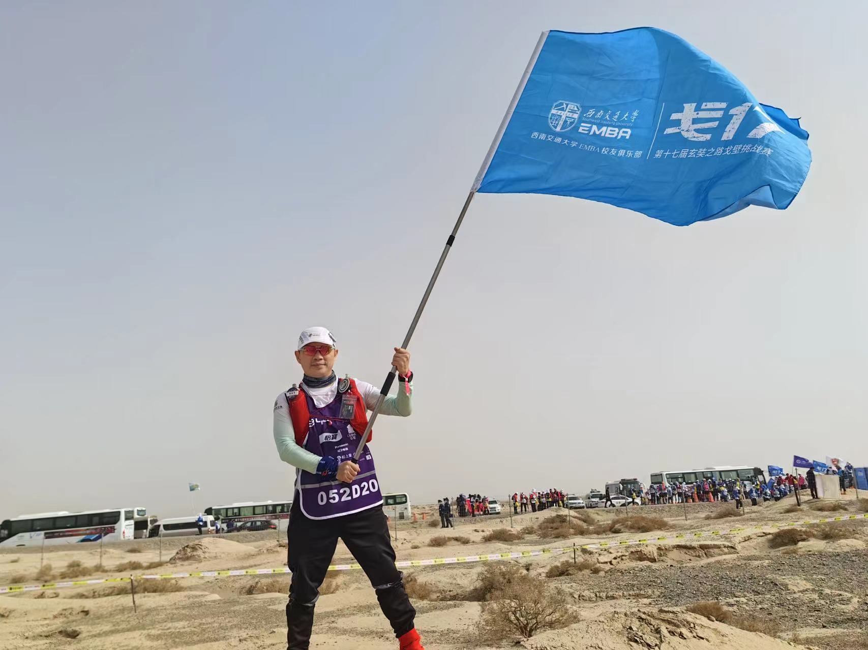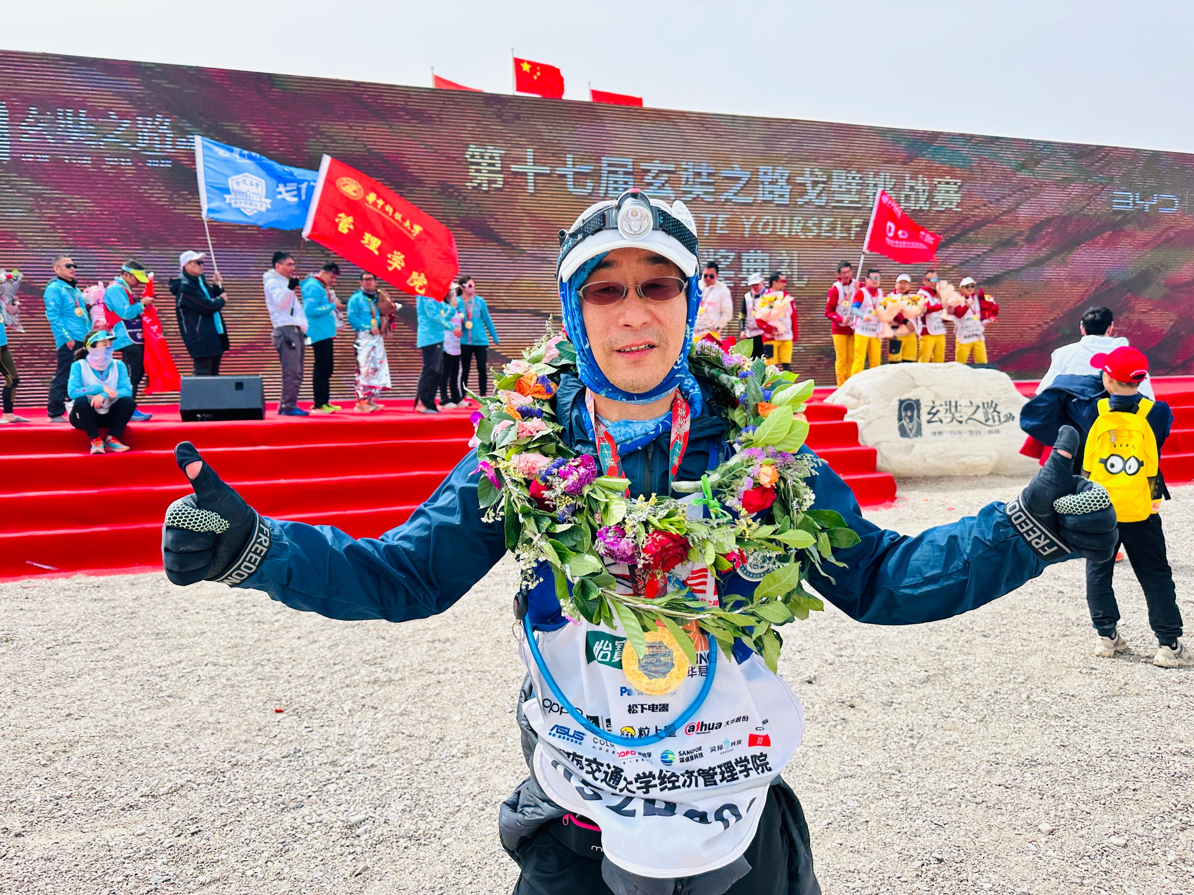 戈赛A+组是玄奘之路戈壁挑战赛最难的组别,选手需在22小时内跑完其他选手在四天三夜内完成的121公里路程,全程需要自补给、自导航,日夜兼程。今年的戈赛,天气异常突变和恶劣,昼夜温差大,风沙肆虐到一度熔断A+的赛程,完赛率只有36%。拓守盛校友以超人的意志力只用了16小时完成比赛。他身披学院旗帜冲过终点时,全场响彻起最激动人心的欢呼声,“英国上市365官网”这几个字也第一次打在戈壁挑战赛舞台的冠军榜上!