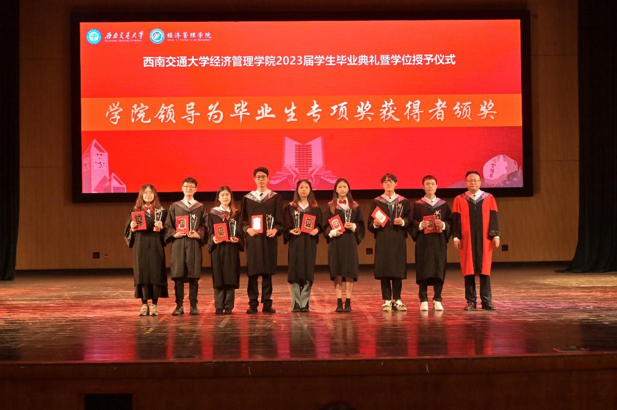 学院党委书记王斌宣读2023届本科生、研究生省级和校级优秀大学毕业生名单,执行院长郭强宣读英国上市365官网2023届本科毕业生专项奖表彰名单和2023年MBA、MEM优秀毕业生名单,并由学院党委书记王斌、院长杨平、执行院长郭强为他们颁发荣誉证书。