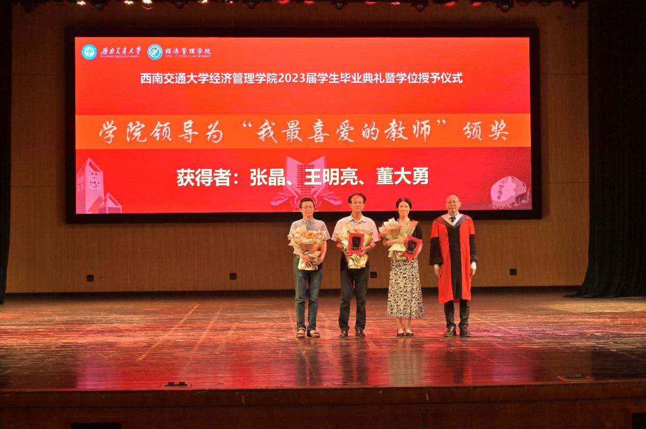 学院副院长李良宣读365官网2023届本科毕业生评选的“我最喜爱的教师”名单,获得者是:张晶老师、王明亮老师、董大勇老师,并由王明亮老师作为教师代表为2023届毕业生致临别寄语。他在发言中,回顾了与同学们共同走过的39年风风雨雨,分享了陪伴同学们成长的点点滴滴,希望同学们在将来仍要积极努力,一定要做一个对社会、对集体、对家庭有责任感的人,彰显我们交大经管新青年的大格局、大情怀、大担当。