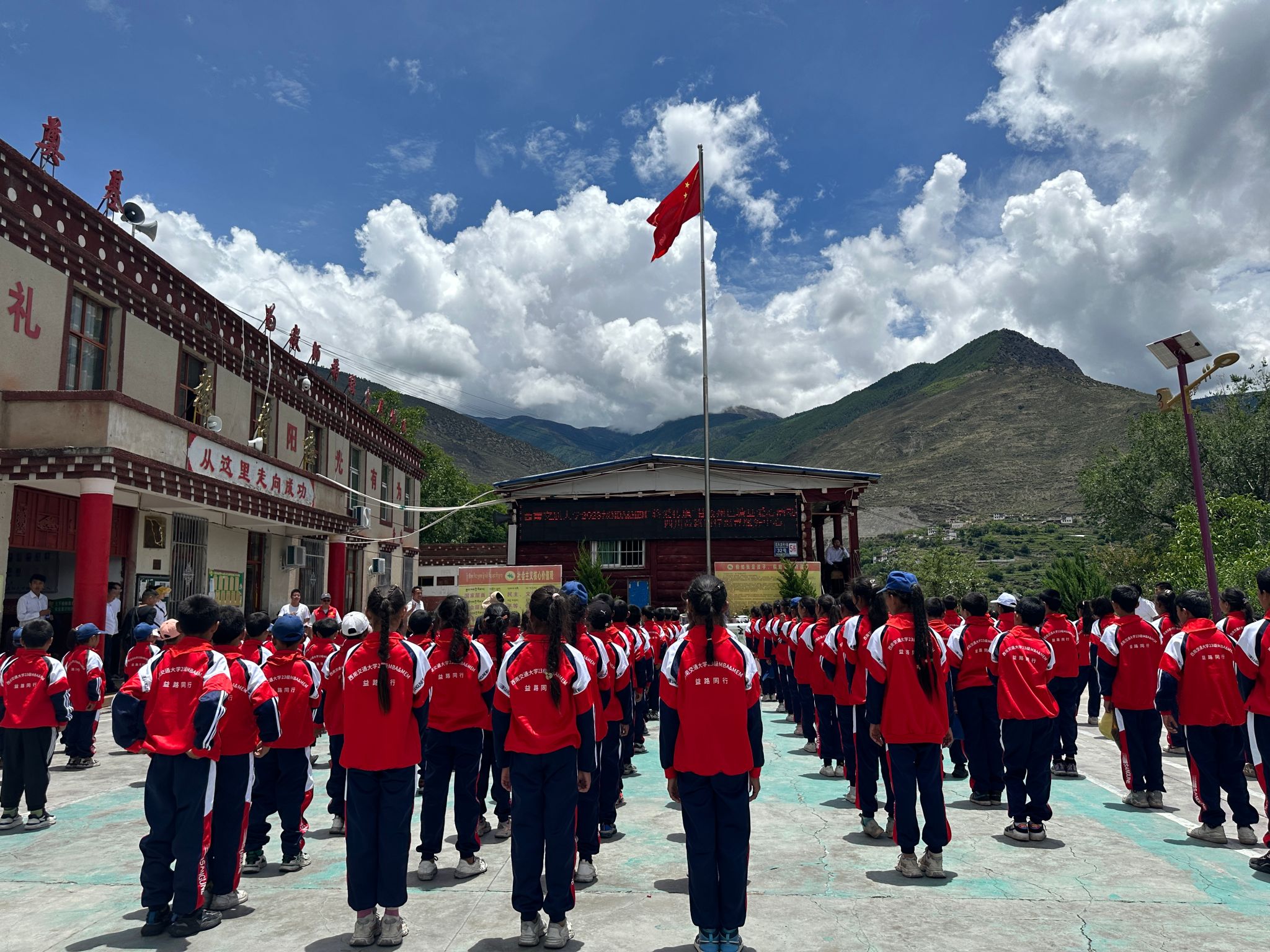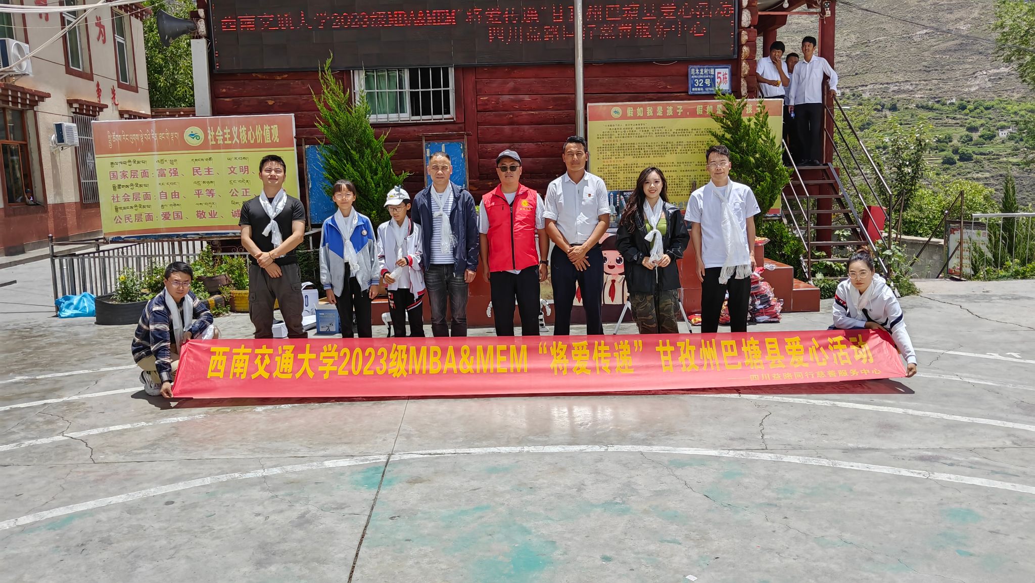2024年7月4日一早,2023级MBA&MEM学子的志愿者代表李泽勇、唐万英、杨云渊、万静彧等在四川益路同行慈善服务中心理事长李强陪同下,经过14小时的艰苦驱车,克服高原缺氧、暴雨拥堵、山高路远的重重困难下,于当晚22点平安抵达甘孜州巴塘县。