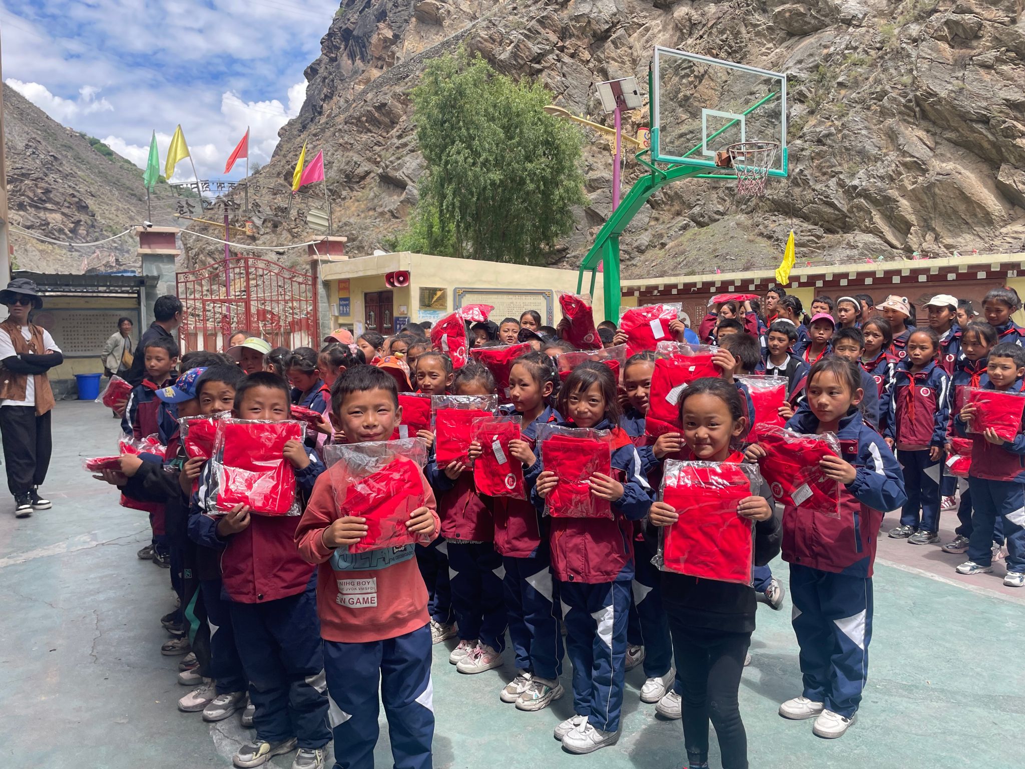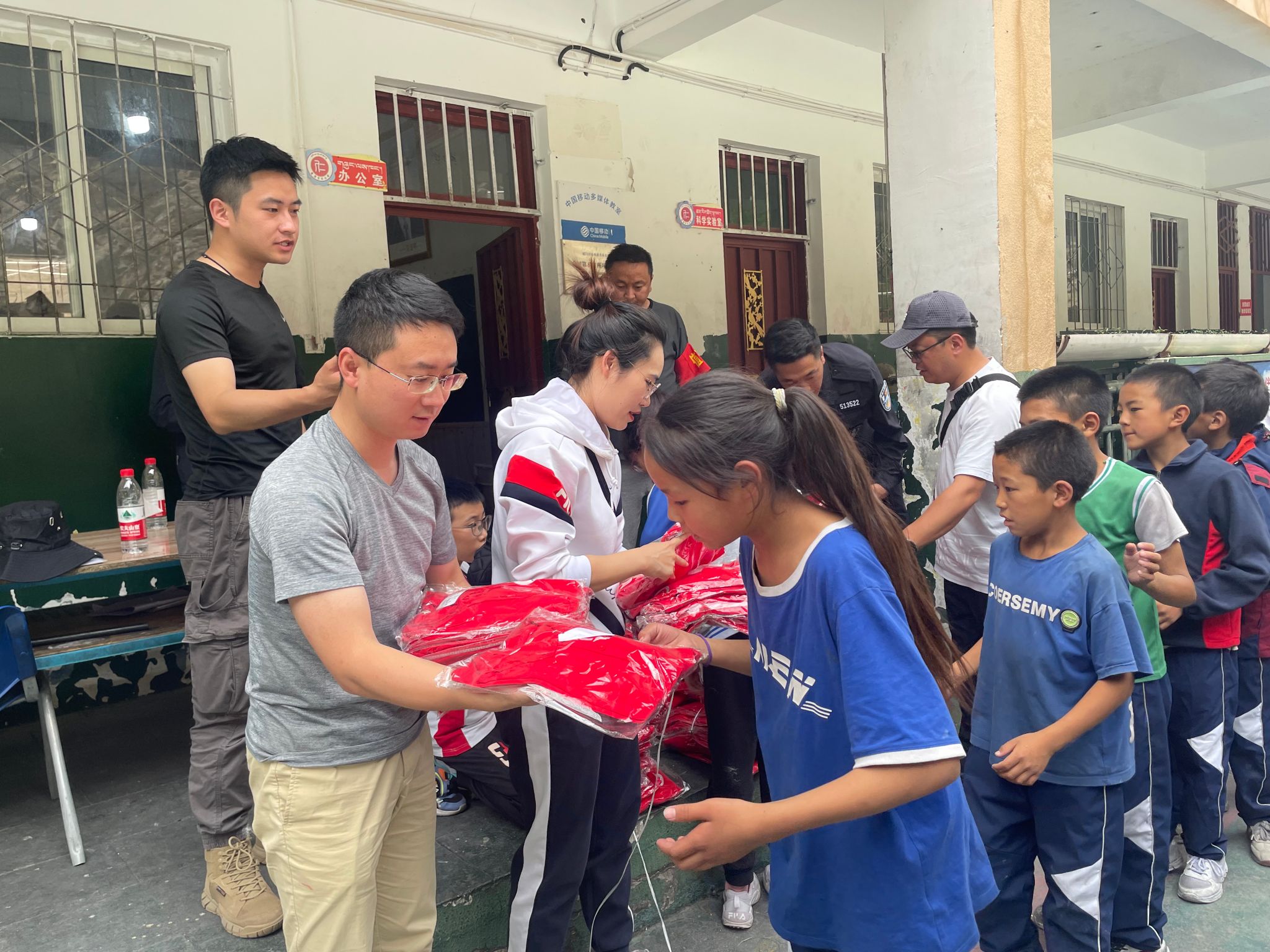 7月5日上午,志愿者们驱车前往离巴塘县城100多公里外的昌波乡中心校、地巫镇中心绒九年义务学校,将爱心送到了孩子们的手中,学校领导表达了对志愿者的欢迎、感谢与祝福。志愿者们为324位藏区孩子分别送去了定制的长袖T恤和校服,并前往中咱乡中心校和巴塘中学为4名长期受资助读书的小学六年级、初中二、三年级的学生送去了本期资助款,带去了来自英国上市365官网莘莘学子的关心和问候。