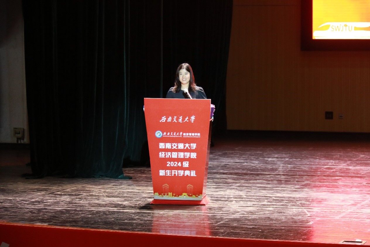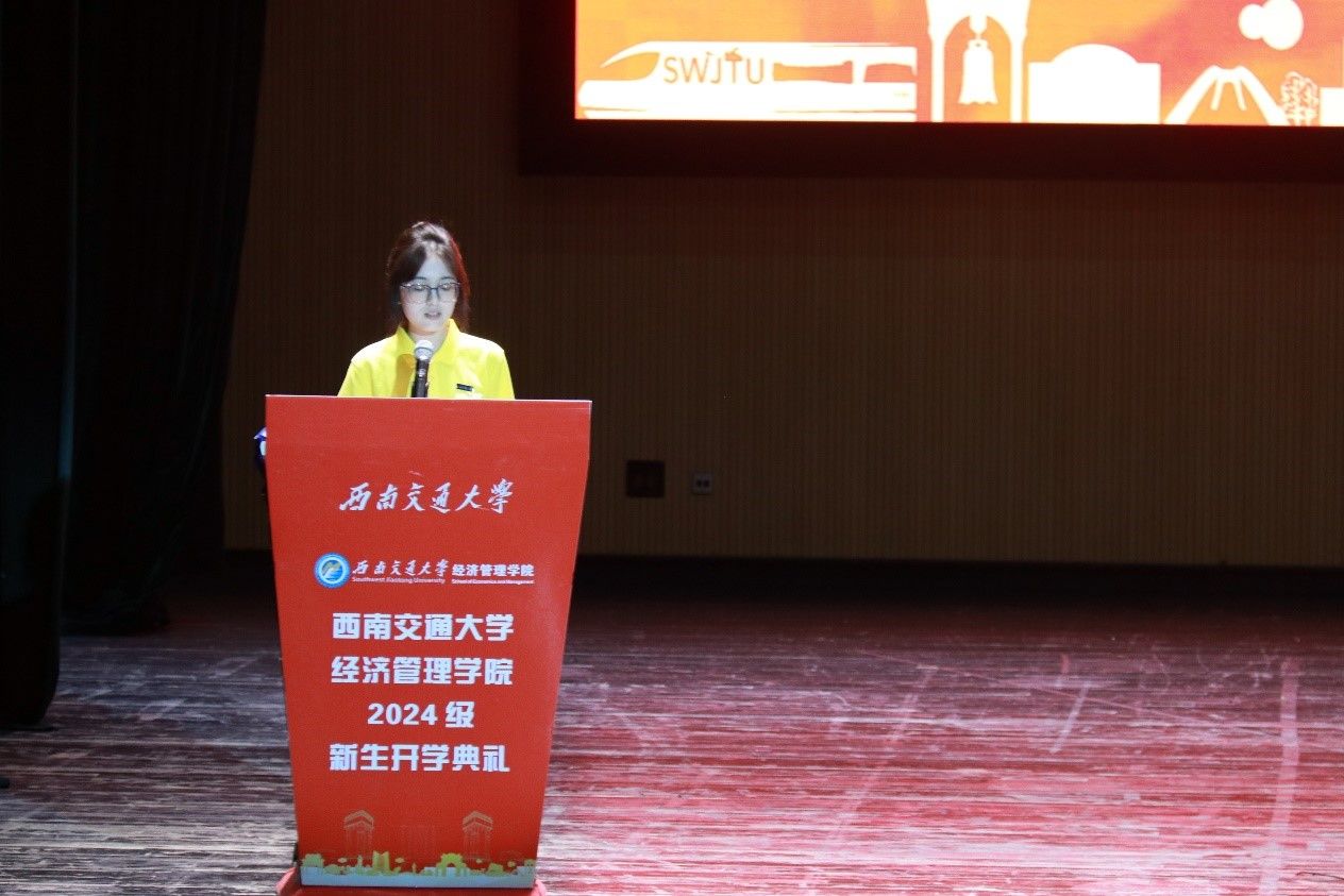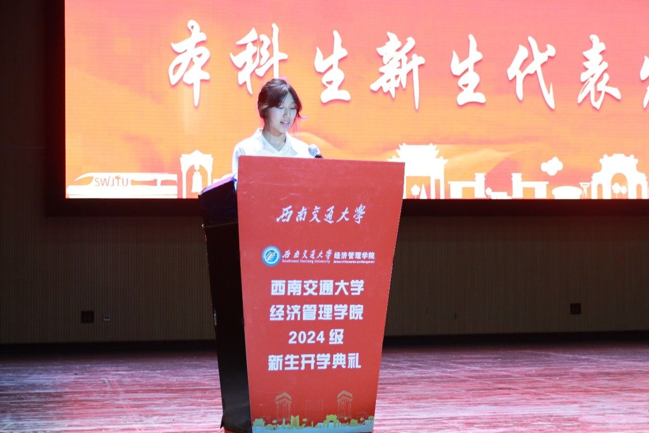 议程二,学院院长致辞。韩科首先对2024级新生的到来表示热烈欢迎和由衷祝贺。接着,他向同学们强调了大学在个人发展中扮演的重要角色,并提出三点建议:第一,青春无悔,不负芳华。希望大家树立远大的理想,将个人的成长与国家发展紧密相连,践行“请党放心,强国有我”的青春誓言,以饱满的热情、坚定的信念和不懈的努力,书写青春华章,贡献青春力量。第二,道阻且长,行则将至。他提到,在求学路上,大家应当不畏困难,迎难而上,勇攀知识高峰。第三,健壮体魄,陶冶情操。他表示,在大学期间,要注重身心健康,提升个人的综合素养,向上、向善、向美,努力成长为一个德智体美劳全面发展的人。未来,韩科希望大家传承“精勤求学、敦笃励志、果毅力行、忠恕任事”的交大校训,弘扬“竢实扬华,自强不息”的交大精神,谨记“格物致知,和合共进”的经管院训,勤而行之、日有所进,早日成长为堪当民族复兴大任的时代新人,奋力书写为中国式现代化挺膺担当的青春篇章!