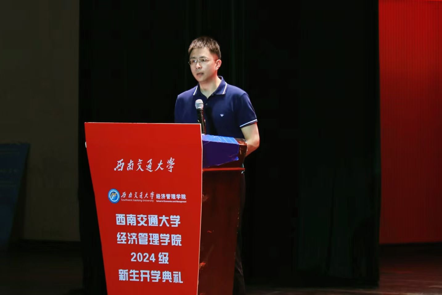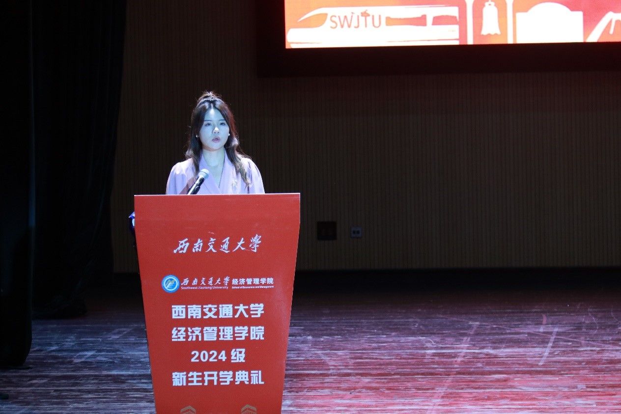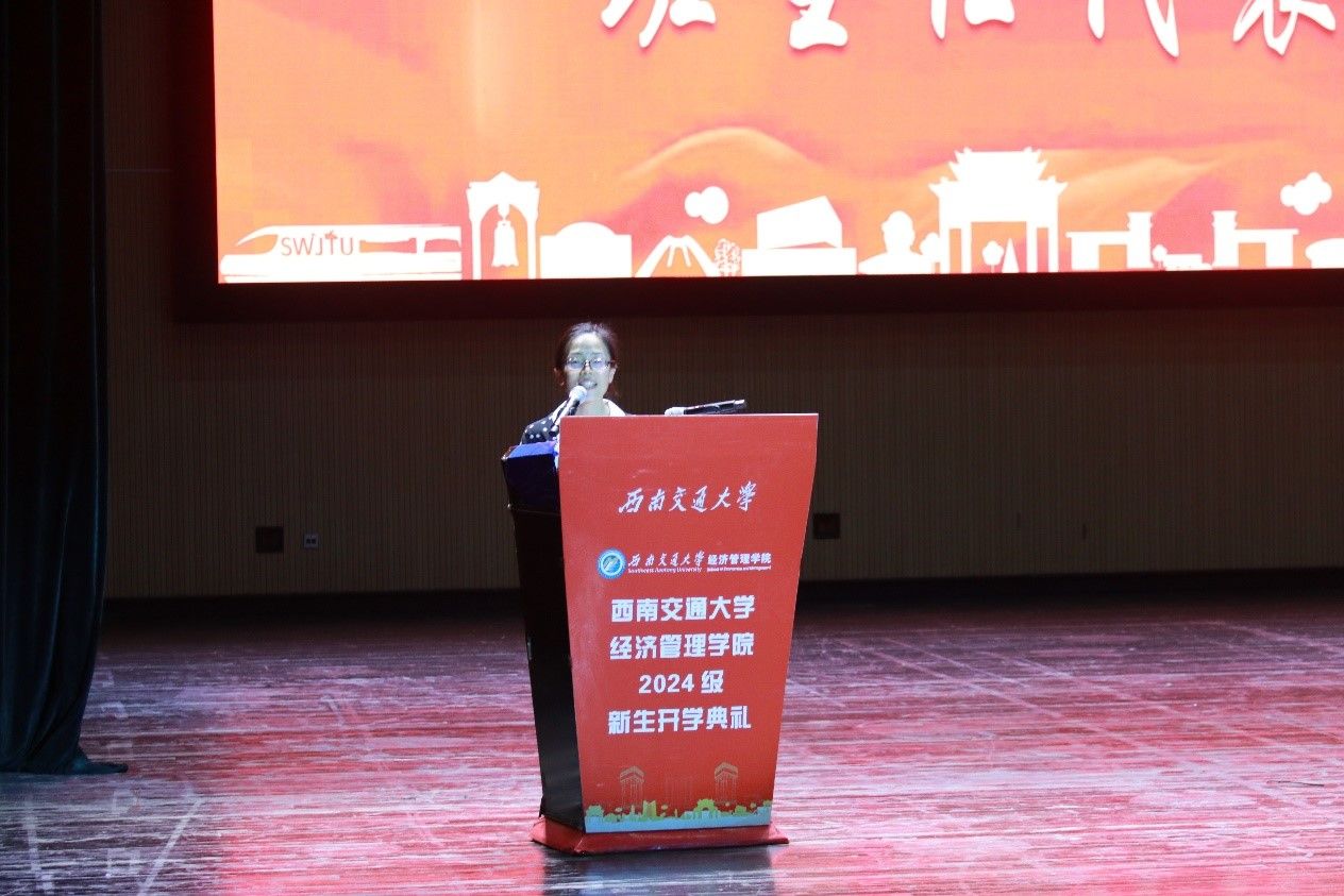 议程二,学院院长致辞。韩科首先对2024级新生的到来表示热烈欢迎和由衷祝贺。接着,他向同学们强调了大学在个人发展中扮演的重要角色,并提出三点建议:第一,青春无悔,不负芳华。希望大家树立远大的理想,将个人的成长与国家发展紧密相连,践行“请党放心,强国有我”的青春誓言,以饱满的热情、坚定的信念和不懈的努力,书写青春华章,贡献青春力量。第二,道阻且长,行则将至。他提到,在求学路上,大家应当不畏困难,迎难而上,勇攀知识高峰。第三,健壮体魄,陶冶情操。他表示,在大学期间,要注重身心健康,提升个人的综合素养,向上、向善、向美,努力成长为一个德智体美劳全面发展的人。未来,韩科希望大家传承“精勤求学、敦笃励志、果毅力行、忠恕任事”的交大校训,弘扬“竢实扬华,自强不息”的交大精神,谨记“格物致知,和合共进”的经管院训,勤而行之、日有所进,早日成长为堪当民族复兴大任的时代新人,奋力书写为中国式现代化挺膺担当的青春篇章!